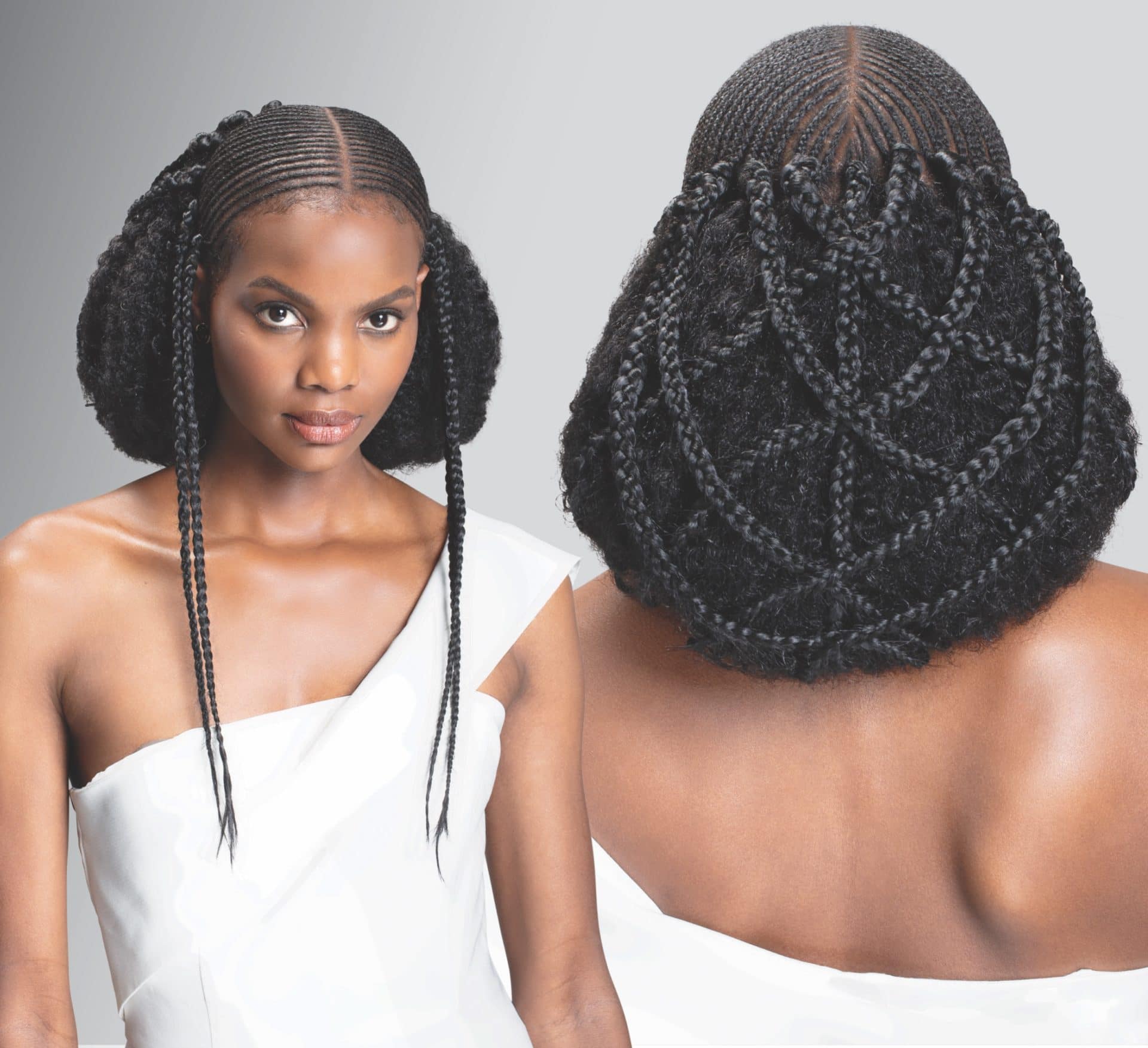 For an updated interpretation, Albertini plaited 15 to 17 fine braids on each side of a center part from the hairline to the crown. Then she added a dozen individual braids across the center back of the style and then crisscrossed them over the Afro at the back of the head. Afterwards she made a dozen individual box braids from the sides and crown and weaved them around the pouf.