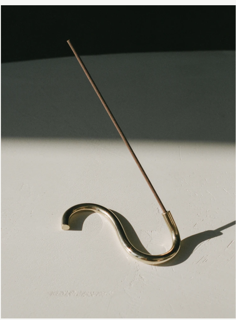 This scent situation is a mood, ideal for core-less Japanese incense. This solid brass, hand formed swirl of art (also availble in three other shapes) mimics the twists of the incense smoke. You can polish it with a cloth to restore the shiny finish or cherish the natural tarnish that occurs over time. Subtle Bodies X Soft Baroque Brass Incense Holder (1)
