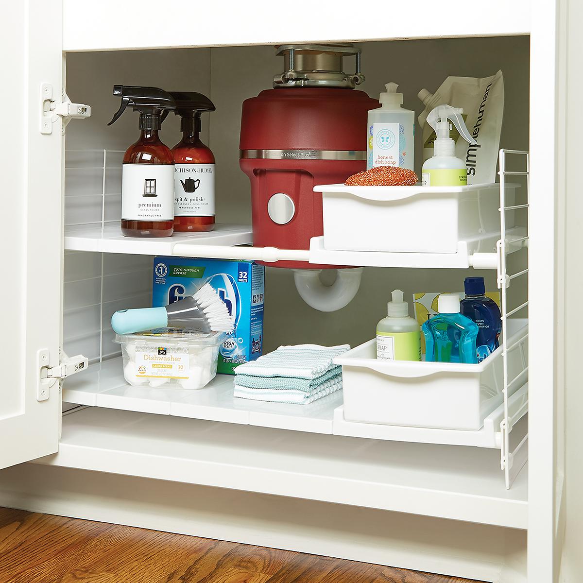 Maximize your under the sink storage area in your tiny dorm with these expandable shelves that fit perfectly around those annoying low hanging pipes.