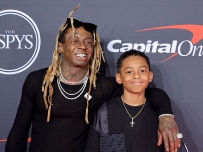 Lil Wayne, a huge sports fanatic, showed up at the event with his son Kameron Carter, whom he shares with actress Lauren London. The 12-year-old matched his dad in a Black ensemble (his was Fendi by the way) and white kicks. They also matched in faces. Can you say twin?