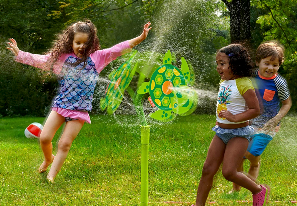 Secure this sprinkler to the ground with built-in stakes that easily attach to any garden hose to spray water everywhere. For controlled action, let kids grab and point the topper where they want.