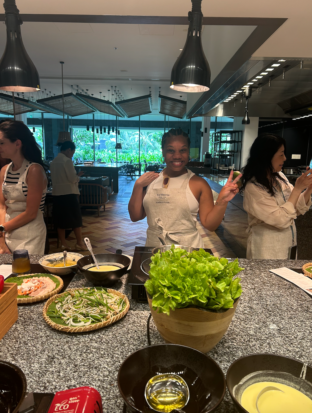 The property also encourages its guests to Eat Well with delicious and nutritious cuisine at a choice of culinary venues. Each day starts in style with a bountiful breakfast at The Verandah, including tropical juices and smoothies from Westin Fresh by The Juicery – an exclusive partnership with The Juicery, which operates cafés in London and Toronto. Hang Ten Beach Bar & Grill is a stylish spot for modern Vietnamese cuisine and fresh, local seafood. Haven Lounge is a casual spot for coffee and “grab and go” bites, while Plunge Bar offers guests the opportunity to enjoy the tropical sunshine with poolside refreshments. I had the chance to experience their healthy cuisine firsthand on the property, as our tour group participated in an immersive cooking class.