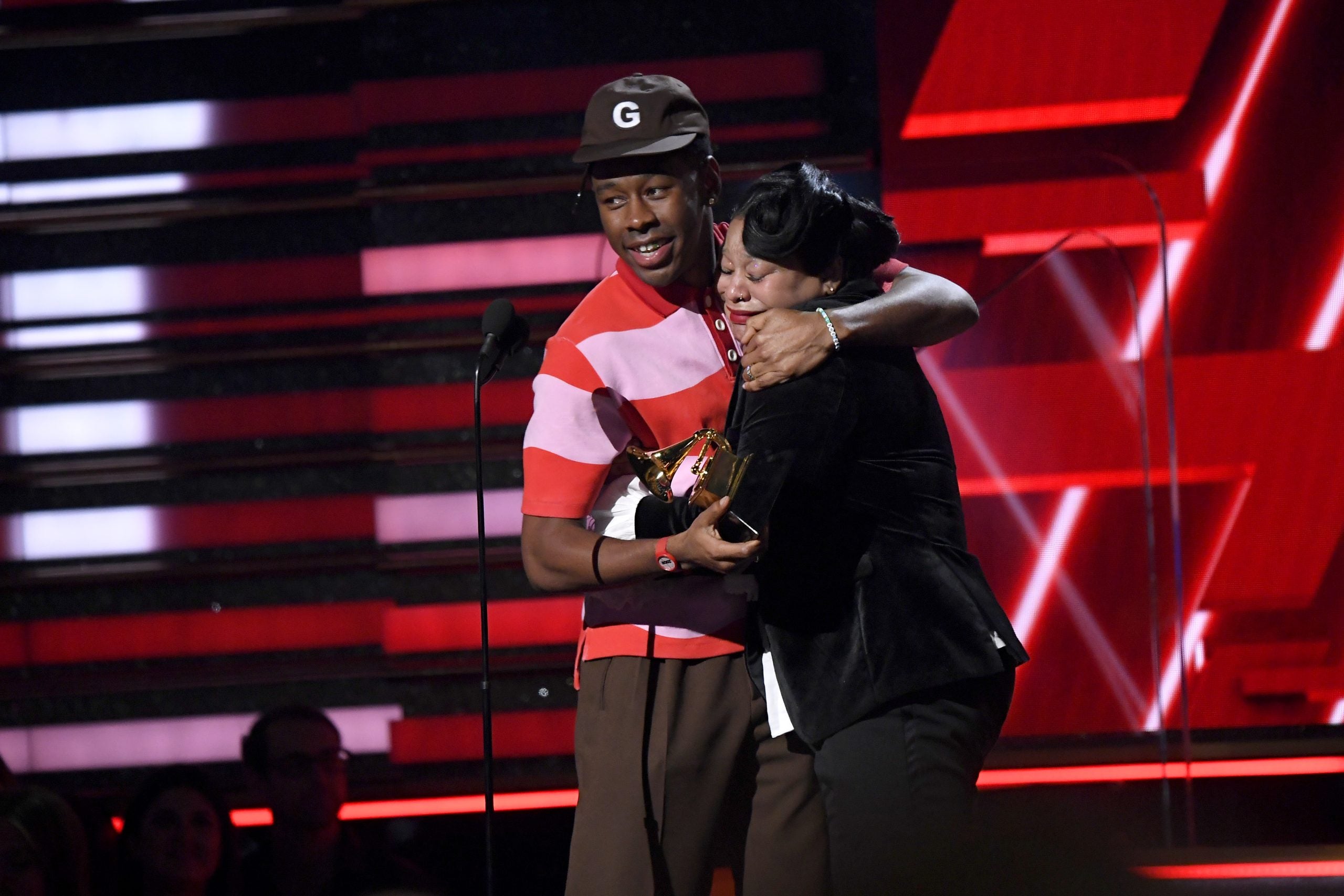 While it’s a nice surprise to see stars show up to events like the Oscars with their mothers (didn’t we all enjoy that gallery?), it’s a familiar sight at the Grammys. If there’s one thing we know, it’s that rappers love to bring their moms to their first big Grammy awards, hoping they’ll get to witness them winning gold. Some of your favorite singers have even brought their moms (and grandmothers, too!). Take for example when SZA brought the women of her family, saying “I had to. My granny came all the way from St. Louis and she’s never flown before.” Some moms have even made their way to the stage when their child took home a gramophone! Like rapper Tyler, the Creator’s mom Bonita, who followed him on stage in tears when he won his first award. He embraced her in a sweet moment, saying, “That’s my mom if y’all are wondering. You did a great job raising this guy.” And one star even had the chance to perform with his mom. The late Donda West took the stage in the theatrical part of when Kanye performed “Jesus Walks” at the Grammys in 2005, where he’d win his first award for Best Rap Album.