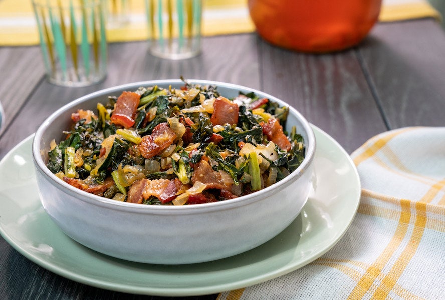 You will never be disappointed with greens, especially chef Kardea’s take on Southern collared greens. This dish is accentuated by roasted garlic and the ultimate must-have for flavor: smoked turkey.