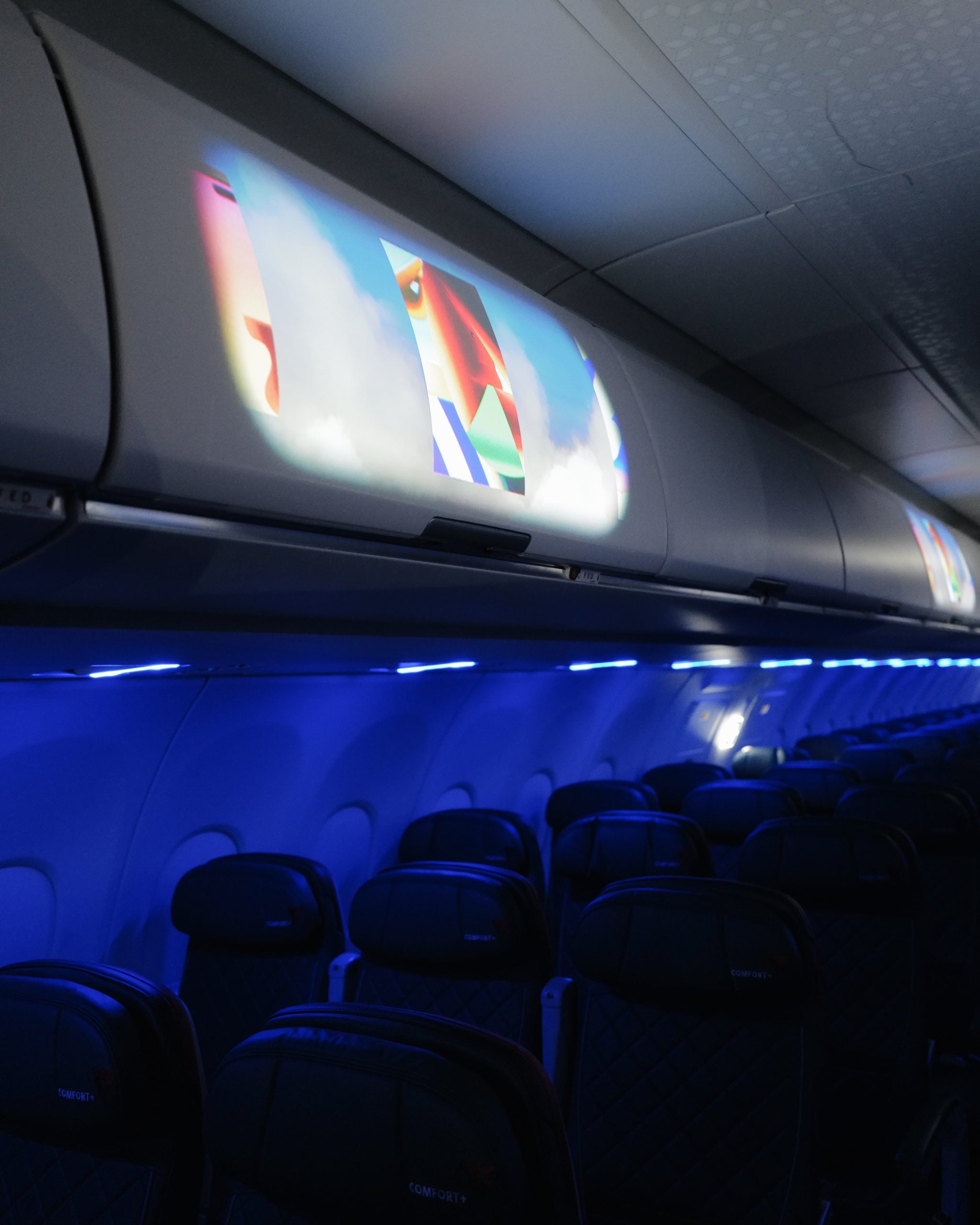 The exploration of art began not long after we took off from the runway where inside the main cabin of the plane, the overhead bins were transformed into canvases displaying the work of six Miami-based artists. Images created by Olivia Pedigo, Emmett Moore, Jillian Mayer, Elliot and Erick Jiménez, and Derek Abella, who traveled on the charter with us, were projected above our heads at 30,000 feet in the air, providing an in-flight entertainment experience more unique than any film or TV show.