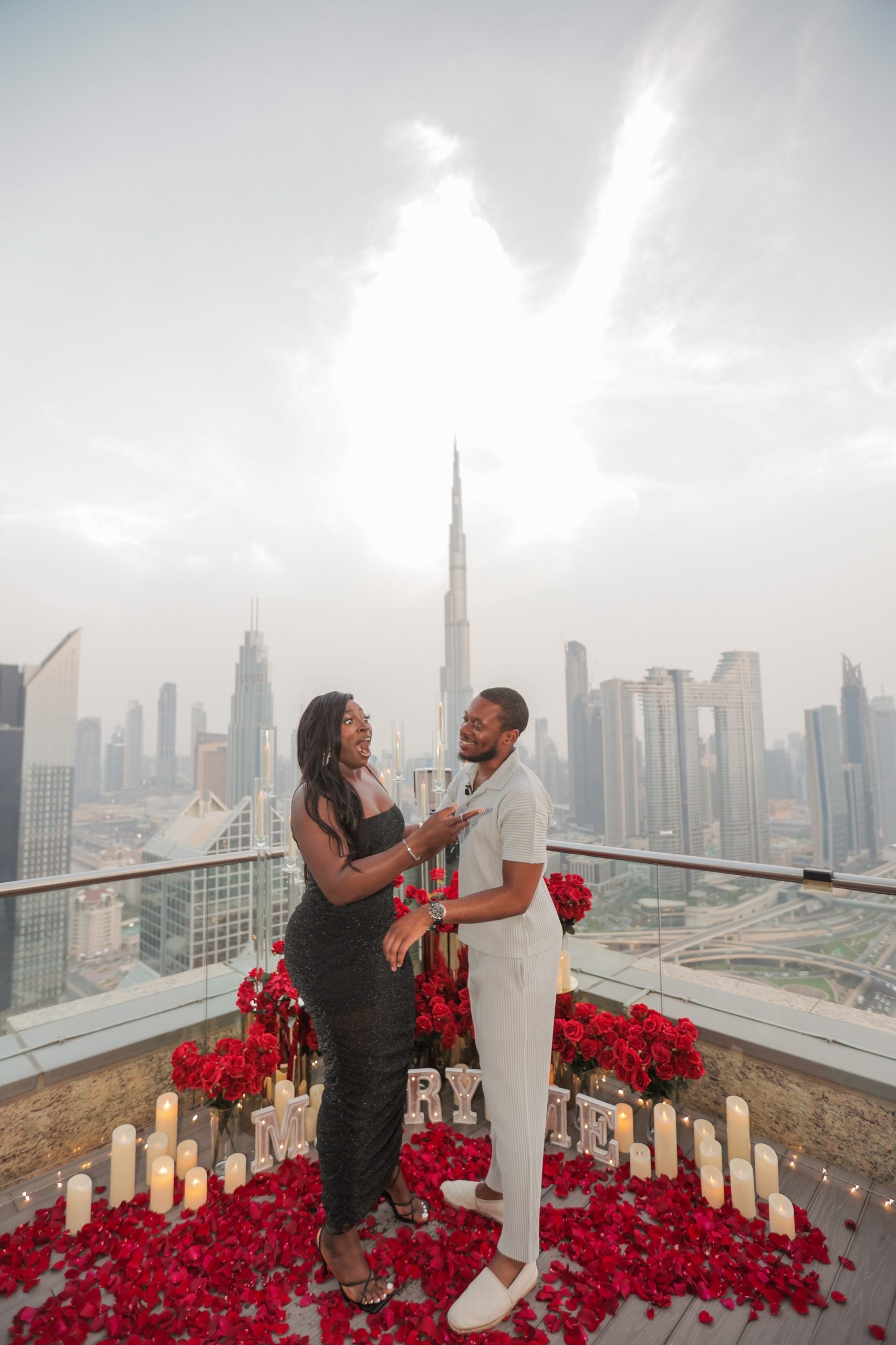 On a trip to Dubai for her birthday in June of 2021, which included her girlfriends and his guys, 15 people in total, he surprised her with a proposal at the ritzy Shangri-La Hotel. They couldn’t have been happier.