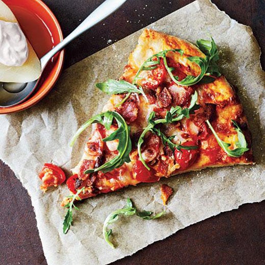 Mix three food groups into one meal with My Recipes’ Bacon, Tomato and Arugula Pizza.
