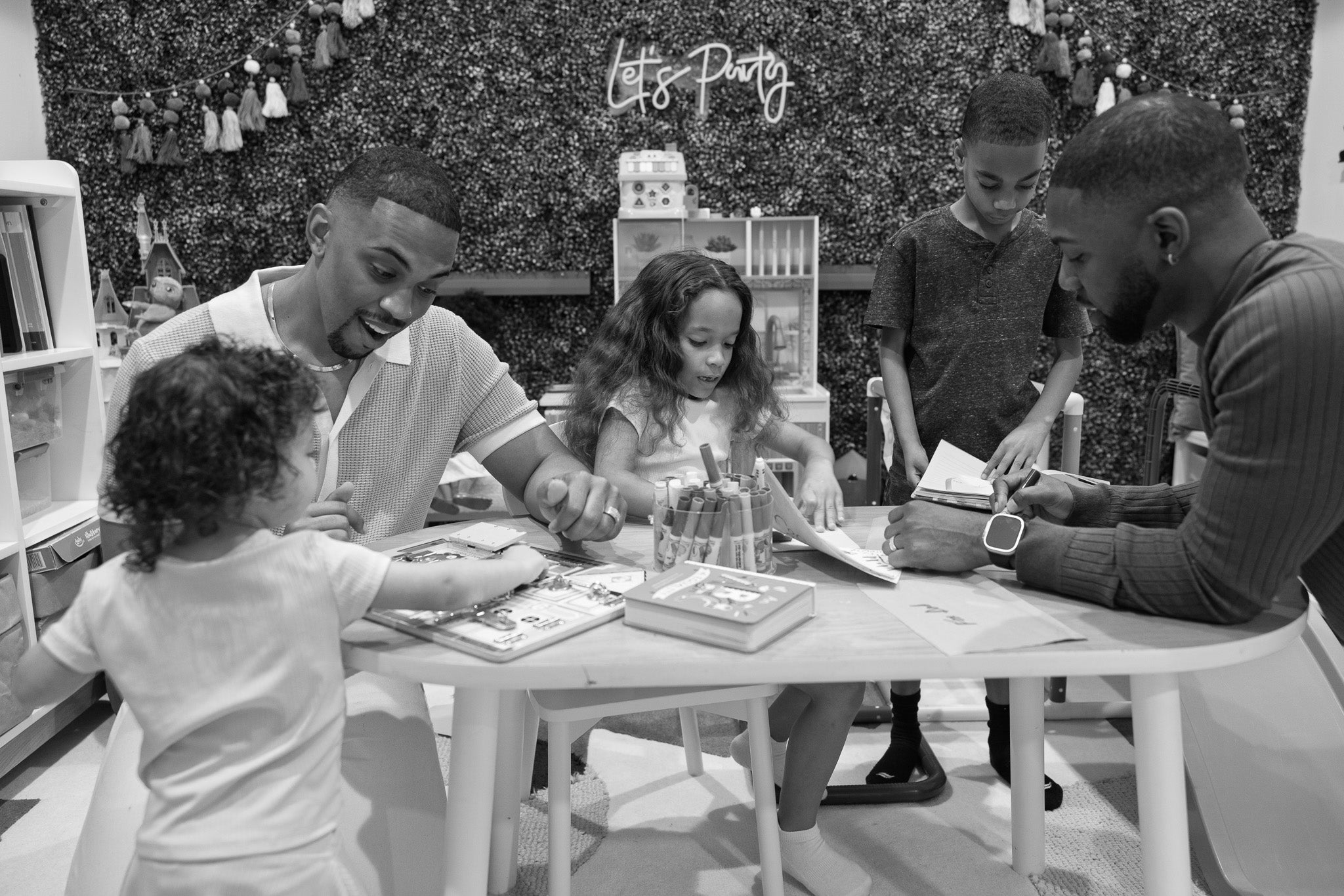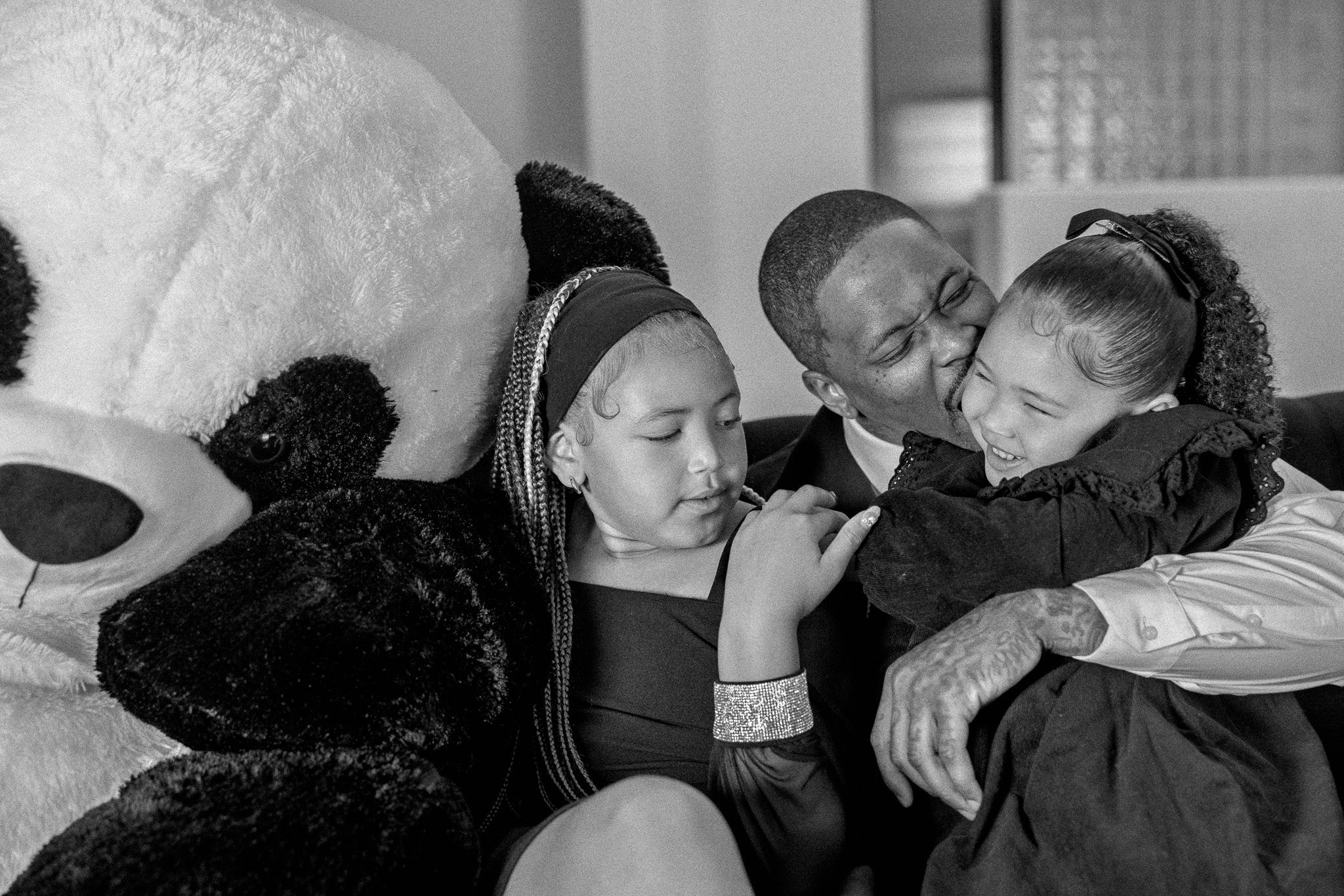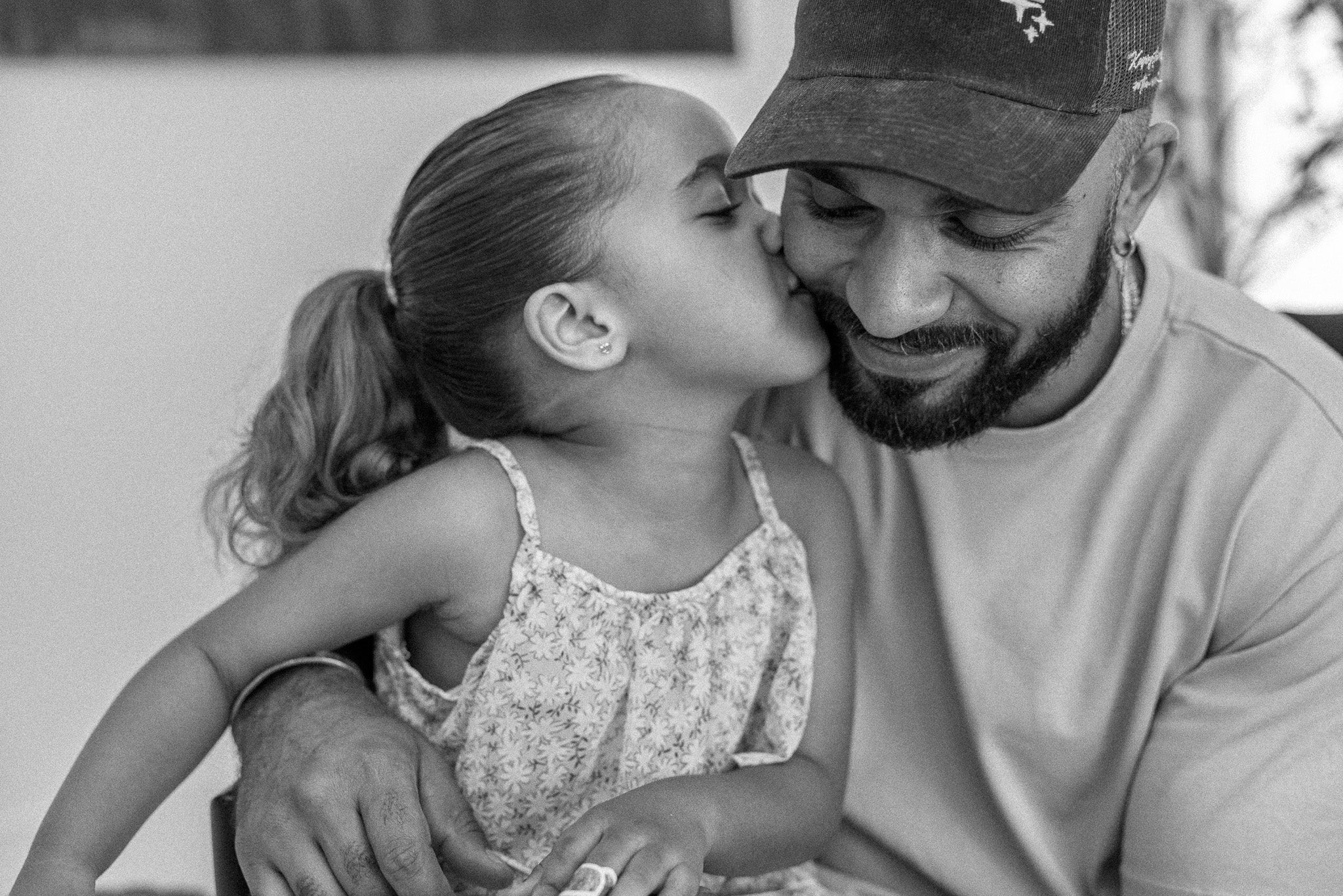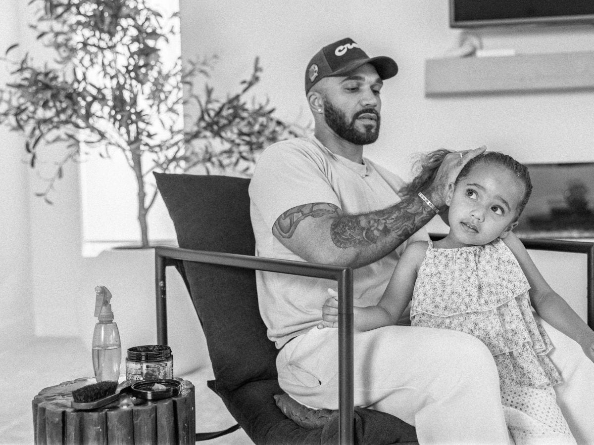This year’s black-and-white portraits are as moving as ever: YG pushes daughters Harmony and Vibe into a pool mid-laughter. Legend shares quiet moments at home with his four children. Lepley gently styles his daughter Jade’s hair. Gaines hangs out at a playground with Hazel close behind. The Josephs lean into the joy of everyday family time with their little ones. Each frame is emotionally textured and intentionally intimate—an ode to presence.