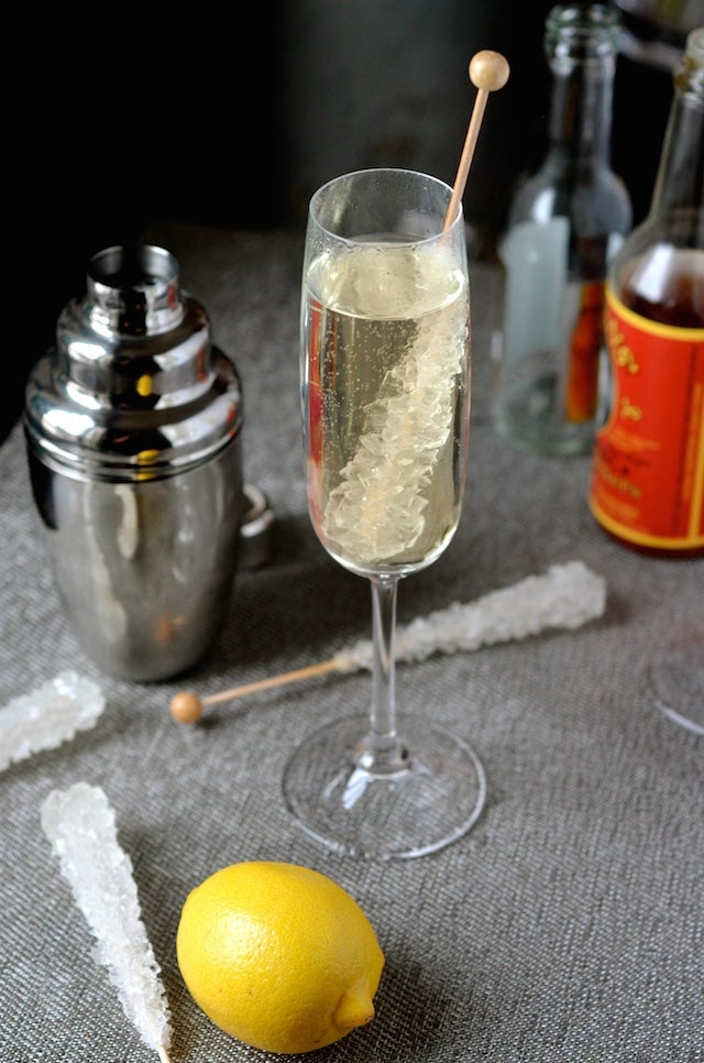 Add fresh lemon juice and bitters to cocktail shaker filled with ice. Shake until frosty then divide into two champagne flutes or coupe glasses.
