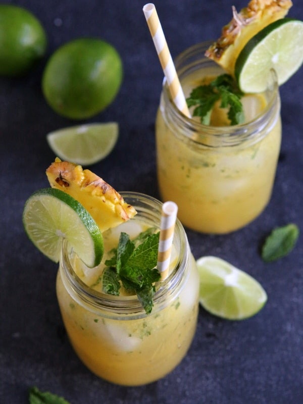 Add ice to tall glass. Pour in pineapple, orange and lime juice. Top with ginger ale and stir in mint leaves. Garnish with a sprig of mint and a lime wedge and/or pineapple slice, if desired. Serve immediately.