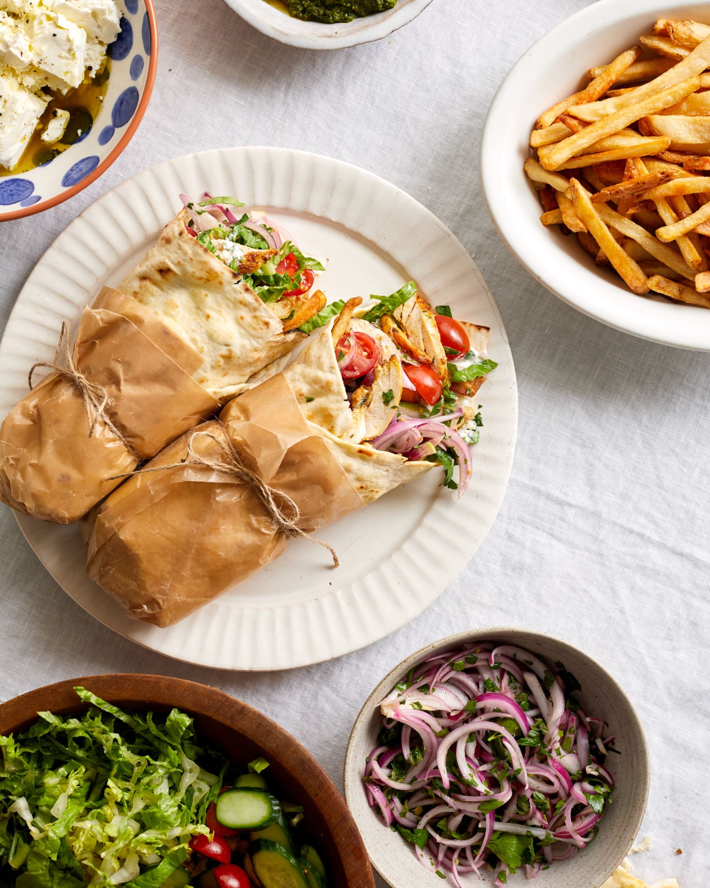 Let cool 5 minutes. (If using pita or flatbreads, stack them, wrap in aluminum foil, and place in the turned-off oven to warm through.) Thinly slice the chicken crosswise.