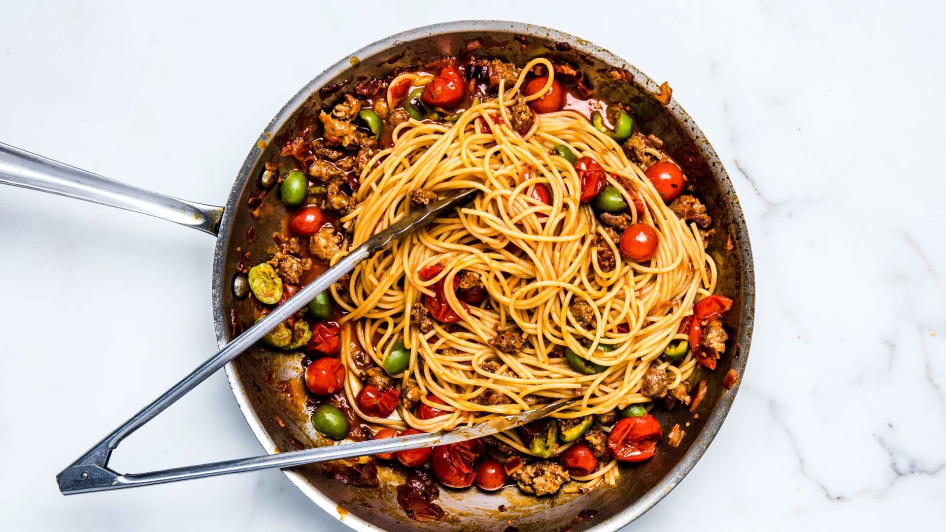 Heat 2 Tbsp. oil in a large skillet over medium-high. Cook sausage, breaking up with a wooden spoon, until cooked through, browned, and crisp in places, 5–8 minutes. Transfer to a small bowl with a slotted spoon. Reduce heat to medium; add onion and olives to skillet. Cook, stirring often, until onion is translucent, about 5 minutes. Add tomatoes, increase heat to medium-high, and cook, mashing tomatoes lightly and stirring often, until juices are slightly thickened, about 3 minutes.