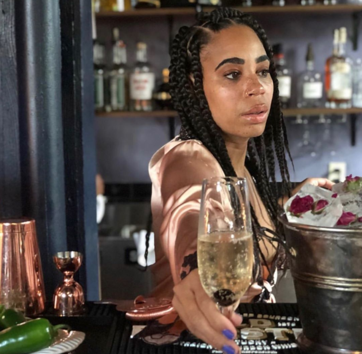 The best cocktails create an experience, and the vibe is set by the person behind the bar. A bad mixologist can have you feeling like you wasted your money. A good one tantalizes your senses, leaving a vivid impression on your mind as well as your tongue long after the drink is done. The latter is the kind of moment 30-year-old Los Angeles native Deniseea Taylor (@chickenandchampagne) seeks to create.