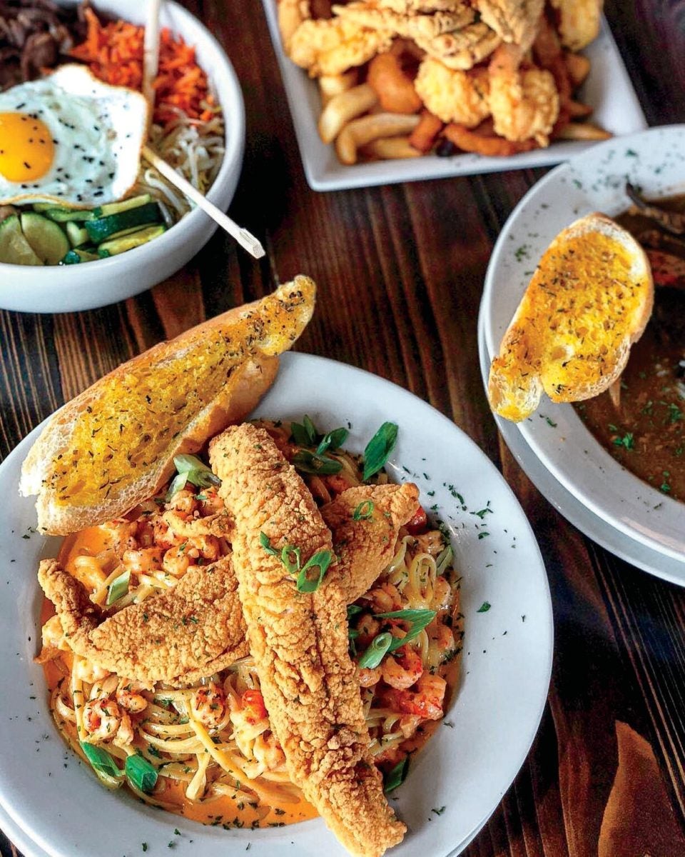Start with the Oysters Morrow, then try the Cajun Crawfish Pasta (above) or the Korean BBQ (Korean sweet marinated short ribs). For dessert, indulge in Lenora’s Hawaiian Bread Pudding.