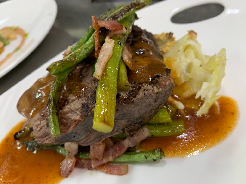 Instructions: Place beef into a Ziplock bag with jerk seasoning. Coat beef in seasoning and place in the fridge to marinate overnight or for at least 4 hours. After marinating, warm olive oil in a large skillet on high heat. Once the oil is hot, sear beef on each side for 1 minute or until brown and remove from heat. In a separate pot, add onion, scallion, garlic and thyme and butter and saute for 2 minutes. Add beef stock and and red wine and bring to a boil, add cornstarch to thicken as desired. Pour sauce over beef and enjoy while hot. (Recipe courtesy of Chef Stefan Spath at Couples Resorts in Jamaica)