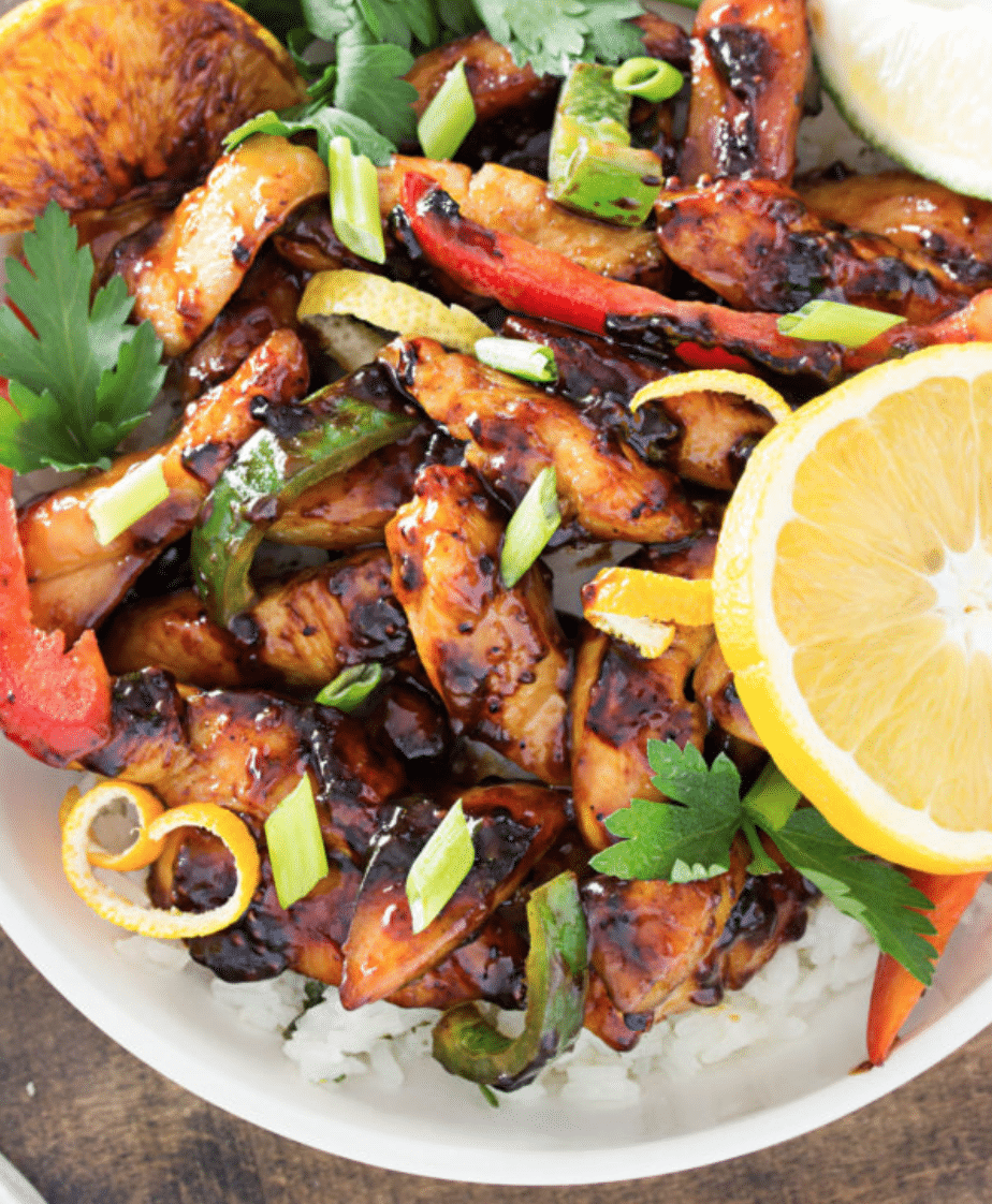 Remove chicken, veggies and oranges to a plate. Serve over rice, quinoa, or as is for a low carb option. If desired, garnish with sliced green onions, minced parsley, and a lime wedge.