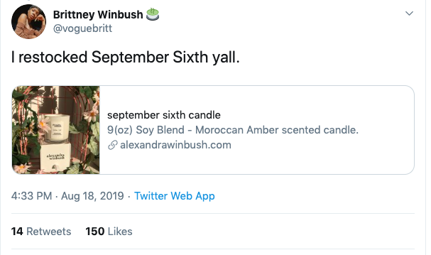 The September Sixth candle, Rae’s favorite, had previously been out of stock. But thankfully, she won’t have to wait much longer. Winbush followed up her incredible testimony with news that the popular product is now restocked!