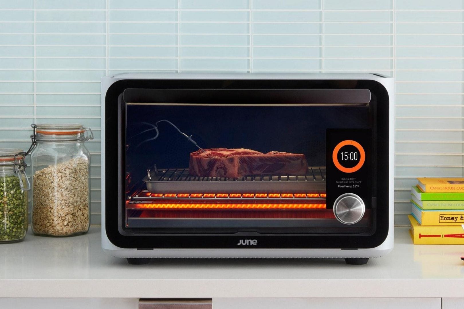 The June oven functions as a 12-in-1 smart kitchen appliance that can bake, proof, broil, roast, air fry, dehydrate, slow cook, toast, reheat, grill, stone fire pizza and keep foods warm. The oven pairs with an app that streams live video and alerts users when their food is cooked. It also comes with tons of easy to make, step-by-step recipes.