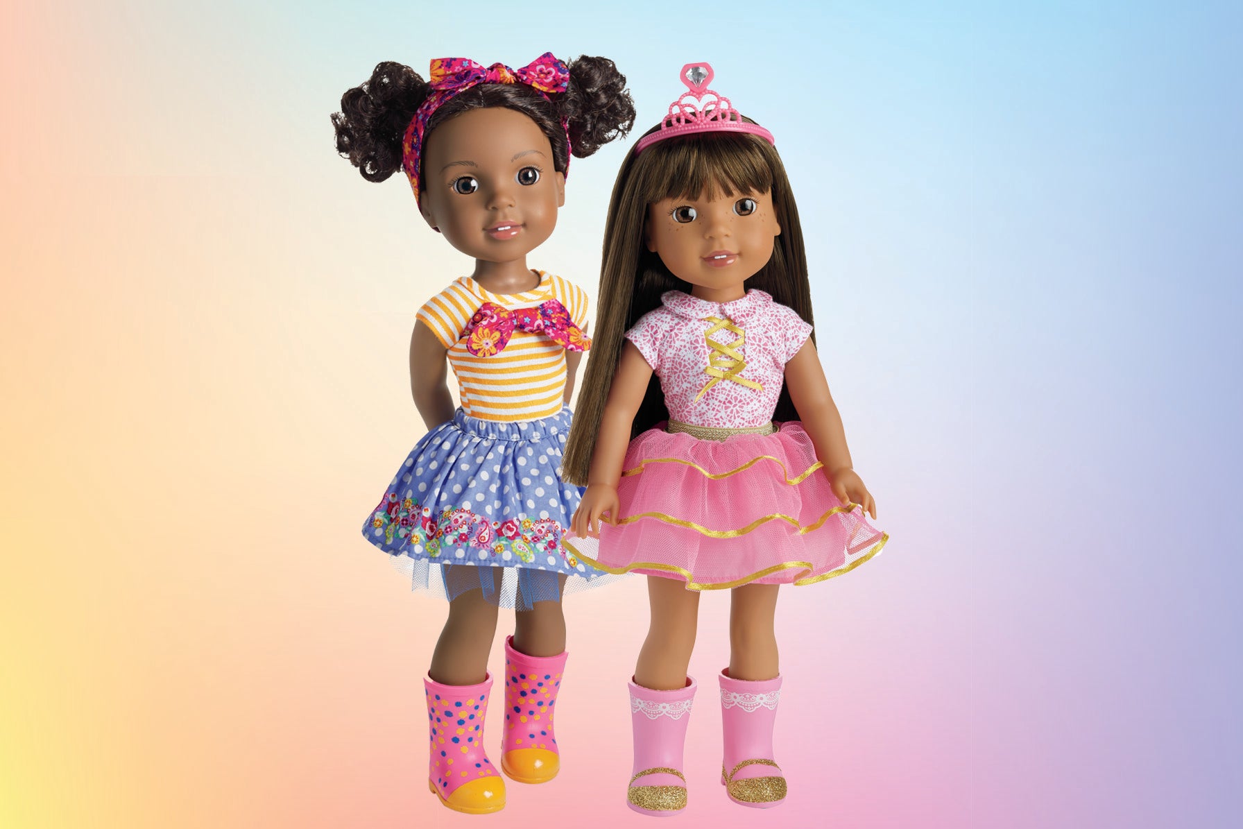 Kendall and Ashlyn are the brown beauties in this collection and we adore them. Kendall has the cutest curly pigtails with a patterned outfit and she’s all about creativity. Ashlyn is known as the princess in training. With her long, straight locks and pink tutu-like skirt, she looks like royalty from head to toe.