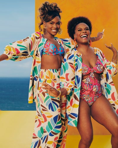 “Most items are under $30. No more than $44,” she says. “The accessories, I call my hair Donna. So we got earrings that are in the shape of me and Donna. We have broaches. We have colorful earrings, as everybody knows I love big colorful earrings as well. We have beach bags. We have little evening clutches that you can take whether to brunch or to dinner. We even got beach towels that match your bathing suits, because I got beautiful bathing suits with tons of color. And yeah, girl, it’s about to be a good summer.”