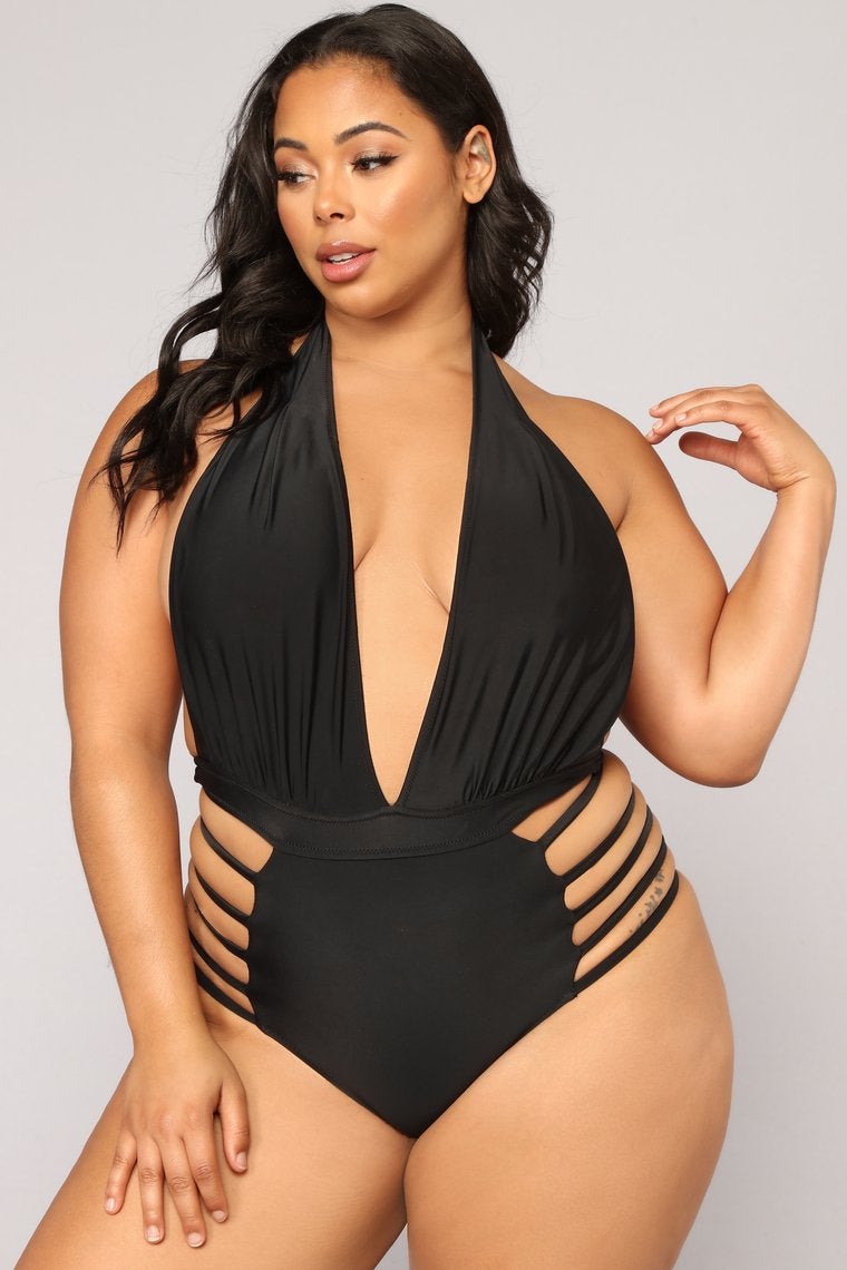 People often think that plus-size swimwear needs to look like something your granny would wear (so not true)! Curvy girls can be sexy on the beach too! The plunging neckline and peek-a-boo cutouts on the hip are sure to sink the heart of a few men when you walk by, trust me!