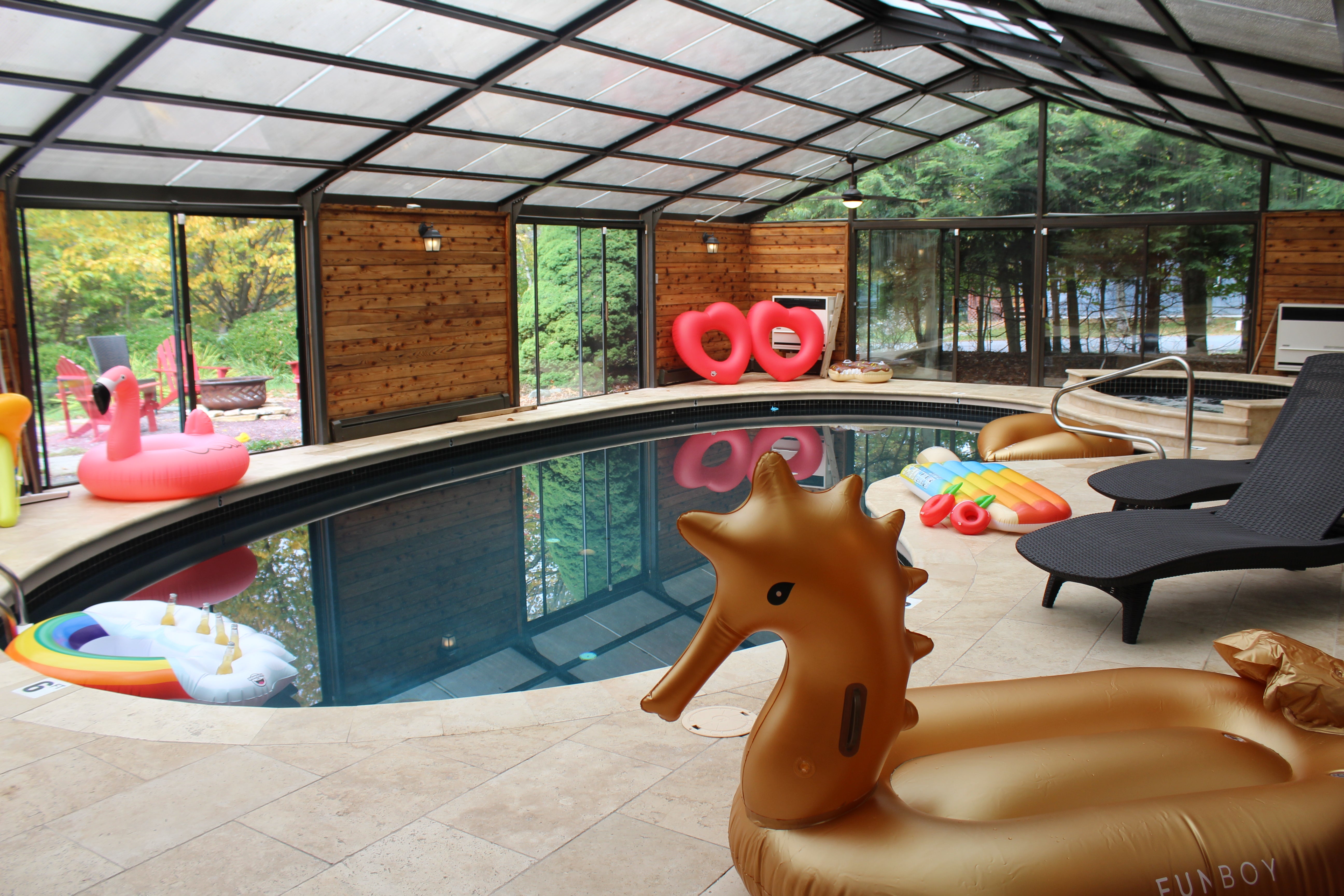 The lakeside home, which sleeps 12 comfortably, features an indoor heated pool and jacuzzi, movie screening room, adult-friendly playroom (complete with a poker table, ping pong, and more), a fire pit and a multi level outdoor patio with a grill. The home even features Sonos technology and speakers throughout, so your playlist can reign supreme no matter what space (inside our out) that your group is getting cozy in. The onsite property manager (who lives nearby), Ritchie, can help with any issues you might have — like starting a fire, encountering a bear…you know, nature stuff!