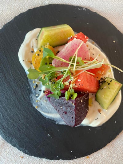 A delectable CBD-infused Watermelon Kachumbari Koji appetizer.