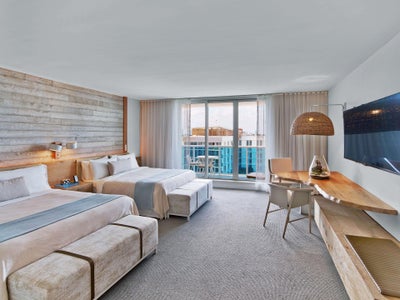The hotel’s stylish eating options include everything from Habitat, a restaurant featuring healthy grab-and-go café choices (Neighbors and Plnthouse), one of which is in the lobby. While you’re there, be sure to head up to the 18th-floor rooftop for Watr, a sky-high restaurant that seems to float over the sea with a Peruvian-influenced Japanese menu (pro tip: get the 24Karat gold sushi), or head to 1 Beach Club, a swanky outdoor beach club with Tulum vibes. It doesn’t end there: If you’re looking for celeb spottings and a high-end atmosphere, head to STK steakhouse, equally famous for its scene as its sirloin, which is also on the property.