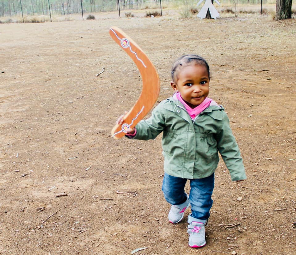 Austen on her first trip Down Under at a boomerang lesson with the Aboriginal Australians.