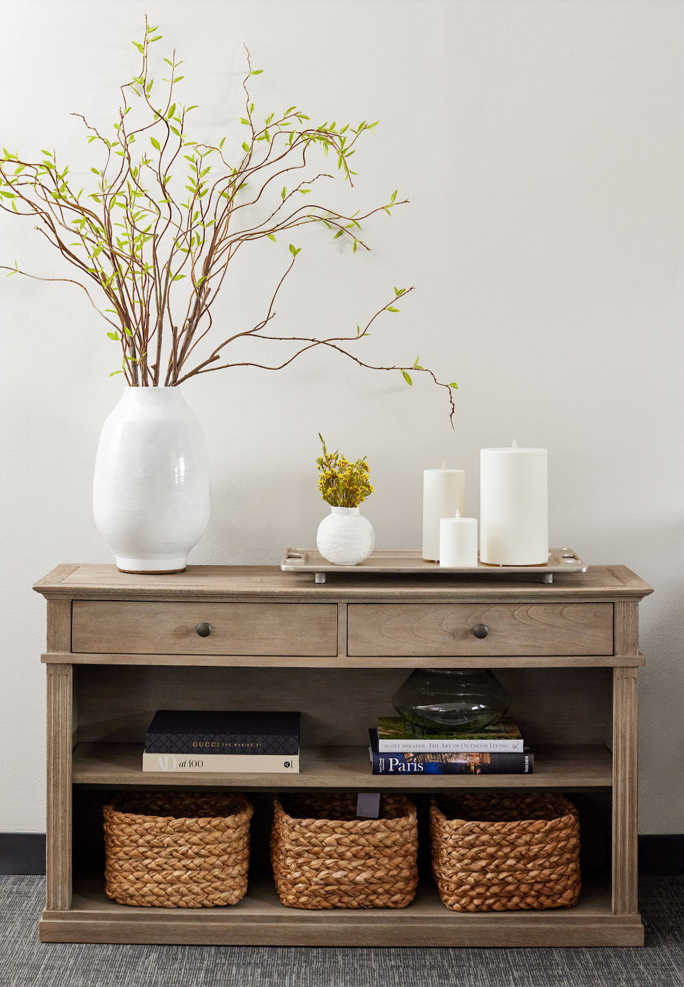 An antique Chinese door served as the inspiration for the Malcolm Collection. Expertly crafted of spruce, the rustic look of the wood contrasts handsomely with a modern metal base. The open design is perfect for a storage basket, making unused space extra functional.