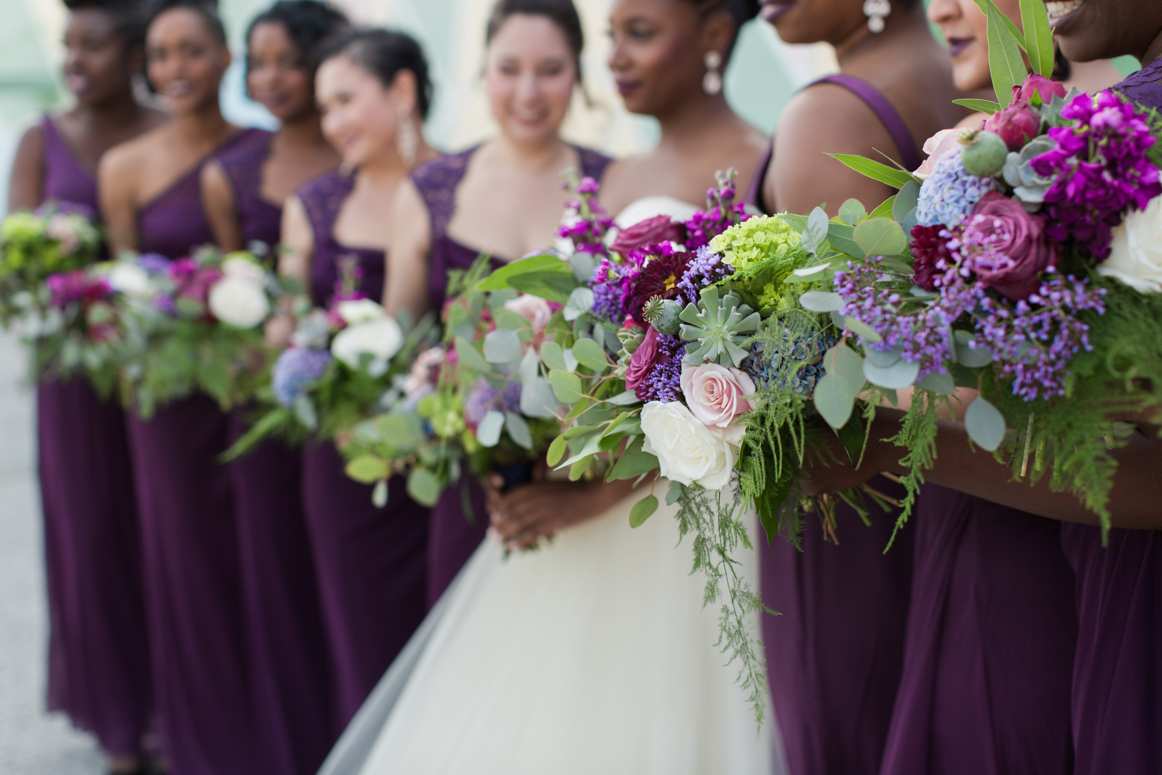 “My bouquet was a mix of rustic and chic flowers,” said the bride. “We used hydrangeas and eucalyptus leaves that dripped throughout. English roses were added to make my bouquet softer. We ended up with a magical combination that perfectly complemented our look, the decor, and the vibe.”