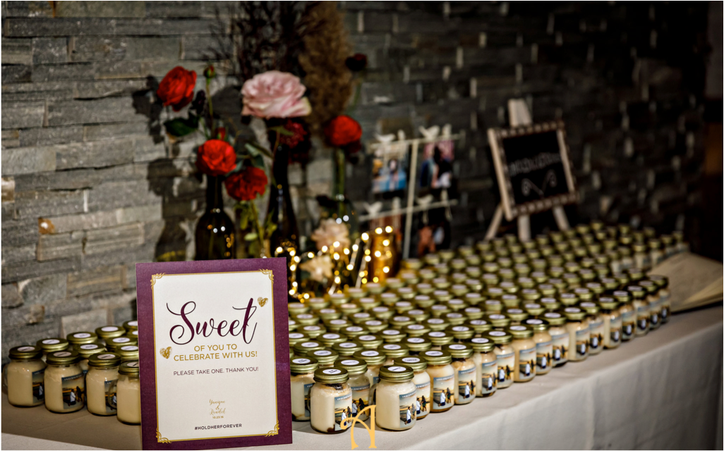 The bride and groom didn’t stick with the traditional wedding cake. Instead, they gave out wedding favors from Lick Your Lips Cakes. “We had mini cheesecake jars by with assorted flavors assorted flavors like red velvet, rum raisin, Kahlua cream, cookie dough,” the bride said. “And she got our proposal photo printed on the jars. They came out great and tasted delicious!”