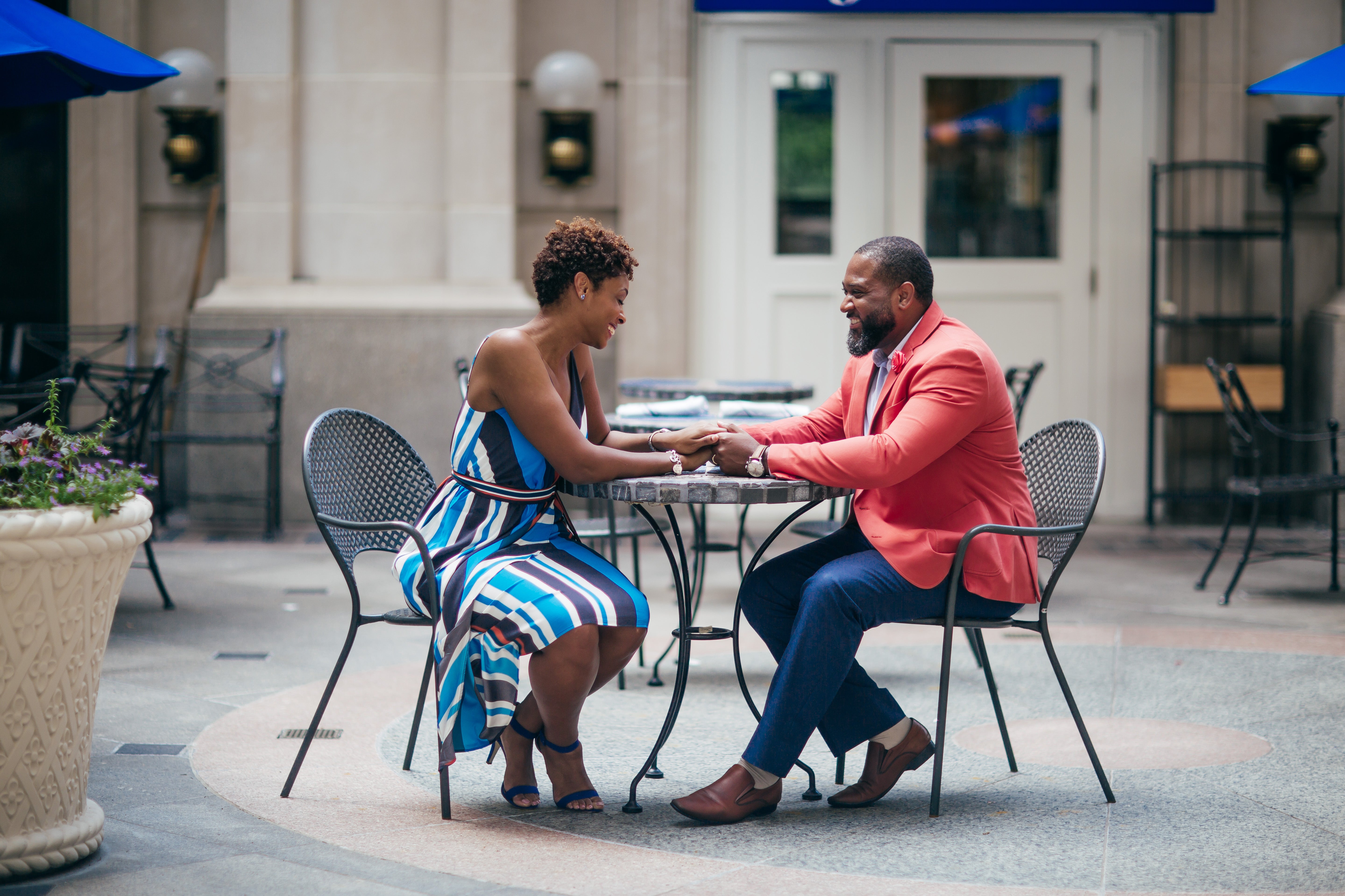 Their Story: “We met at an intersection while crossing the street,” says Krystal. “He was crossing from one side of the street and I was crossing from the opposite side. We locked eyes and once we got close enough, I said ‘I love it,’ referring to his royal African print attire. This was around midnight at a popular art event in DC called Art All Night.”