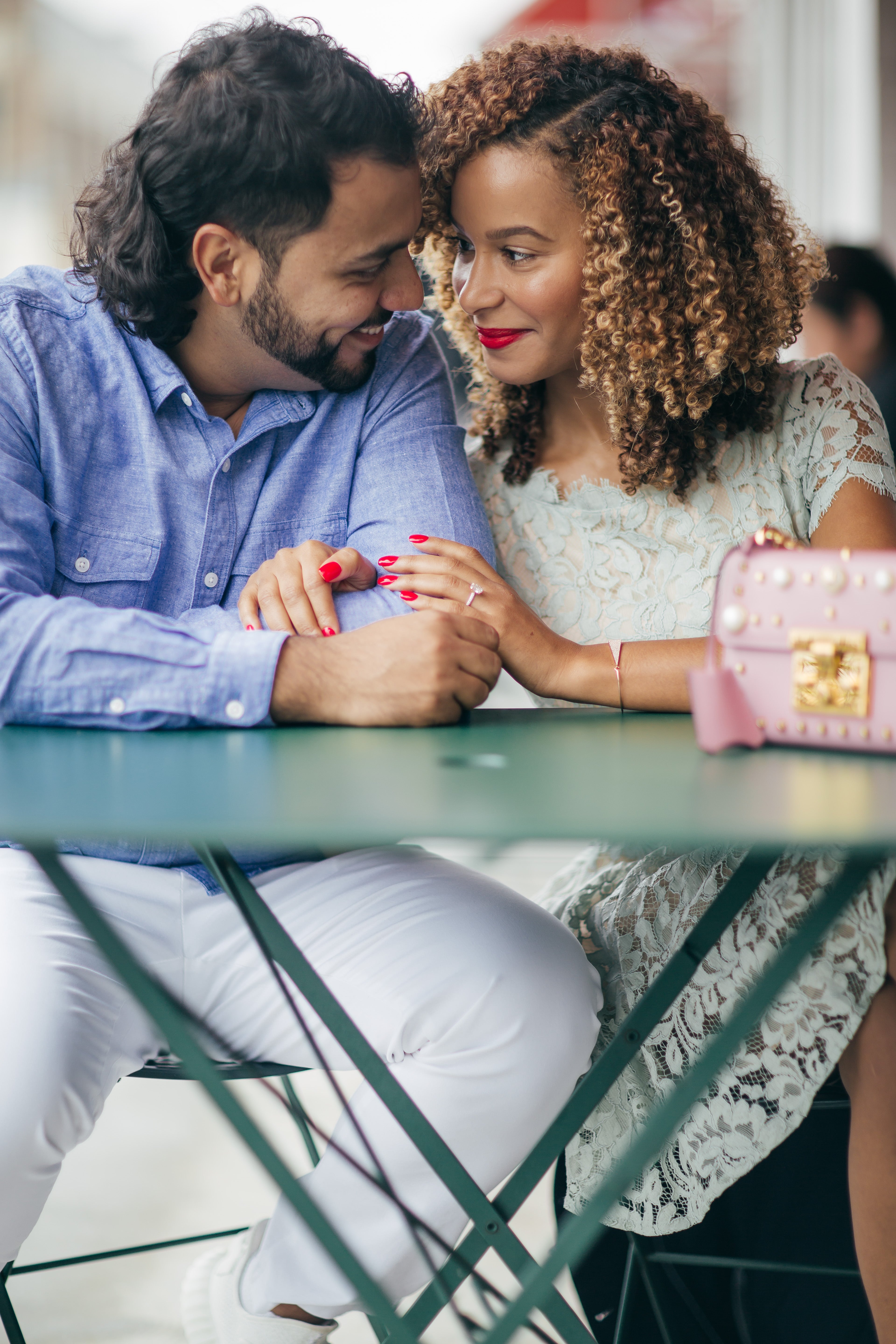 Their Story:“Chantal and I met as we crossed paths chasing our dreams of becoming models. We both were walking for the same designer. Waiting to go on stage the music couldn’t keep us still. I noticed her enjoying the music in light spirit as much as I was and before we knew it our energies filled the room. As Afro beat rhythms played in the background I made my move and asked her, her name and we shared laughs ever since. Later on that evening, we went on our first unofficial date, which happened to be by luck because we were both looking for the “after party” to the fashion show. Little did we know we were walking into a circular rotating dining area overlooking the city giving us the perfect romantic set up. It was not far after that I asked her to be my valentine and not far after that did I ask her to be my girlfriend. Till this day we are still happily pursuing our professional modeling careers. We have the blessing of being best friends, a support system for each other and lovers.”
