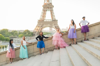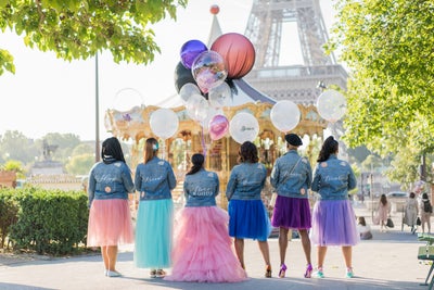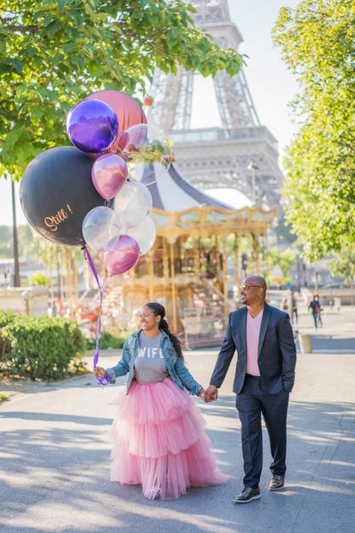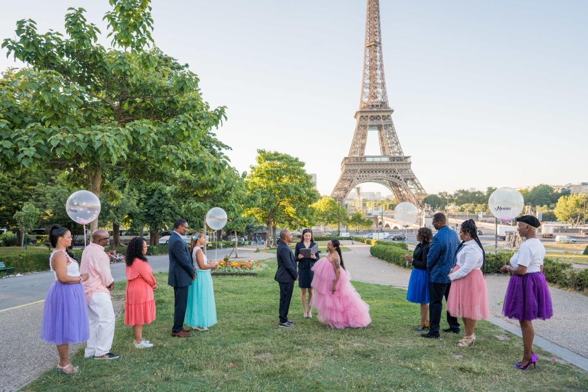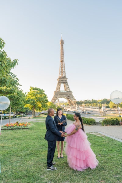 Paris Photographer Pierre Torset perfectly captured the colorful and effervescent vibe of the Woods’s special day. “The vows and rings we exchanged at the foot of the Eiffel tower in the Trocadero gardens,” Mrs. Woods tells ESSENCE. “Afterwards, we took two Mercedes Benz vans around town for a photoshoot with our family and friends.”