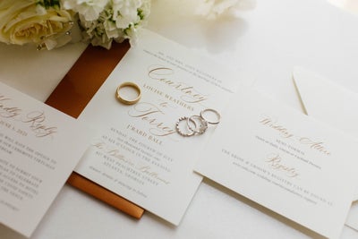 The invitations, seen here with the couple’s rings, were made by Kimberly Davis of Bliss Creative in Atlanta.