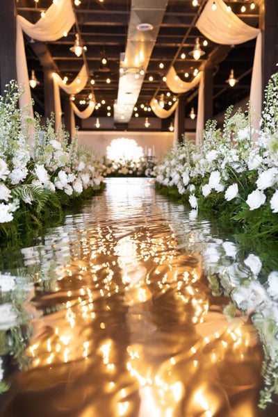 The idea to have the aisle covered in water was Lawrence’s. For an indoor wedding it was unorthodox, but their wedding planner, Danielle Lea, found a way to make it happen.