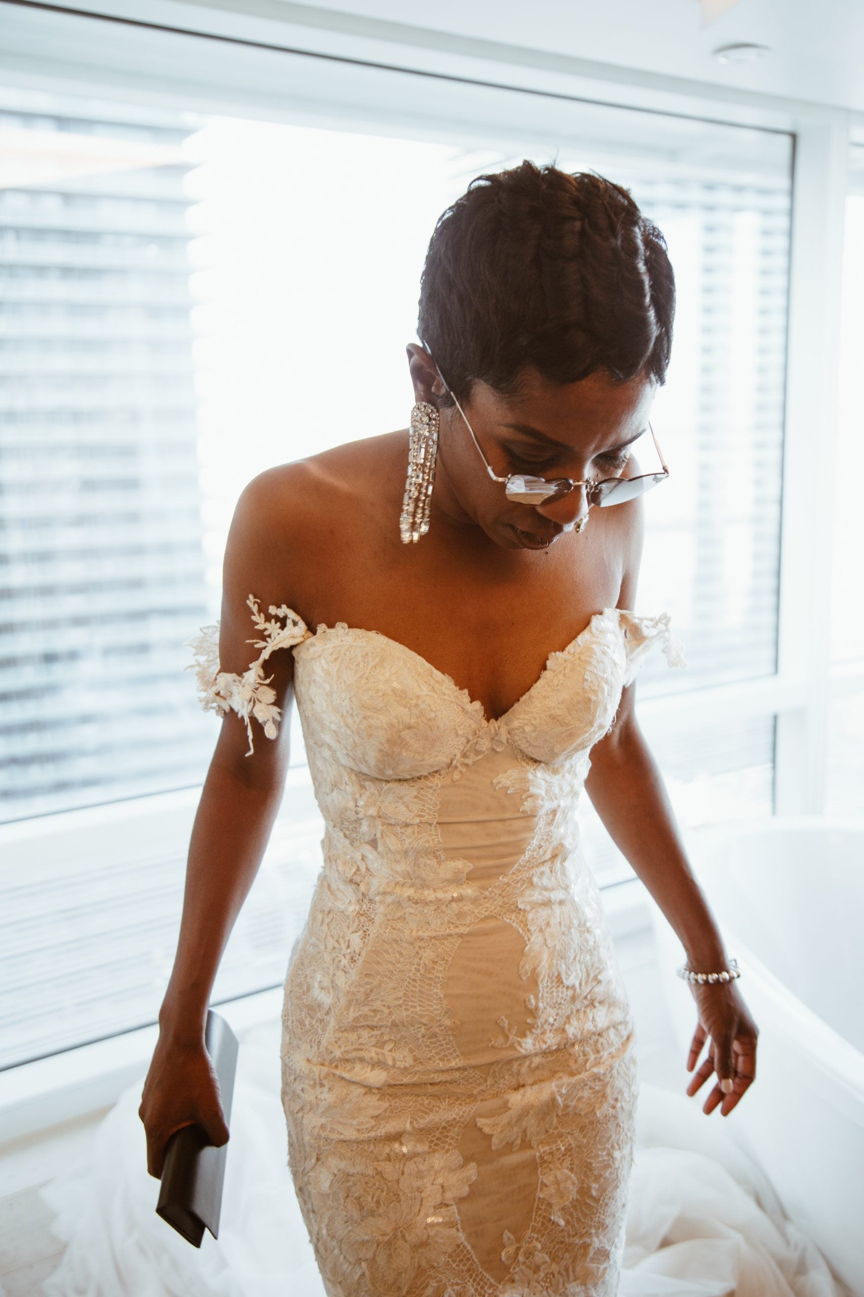 The bride was styled by celebrity stylist Ashley Sean Thomas (who has worked with Toni and Tamar Braxton, Brandy, Niecy Nash and more) wearing a Galia Lavah gown for her first of three looks.