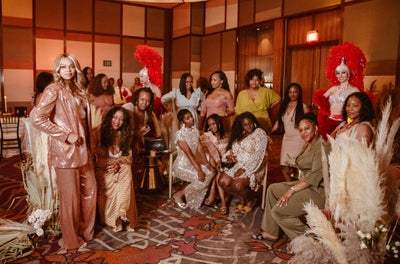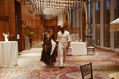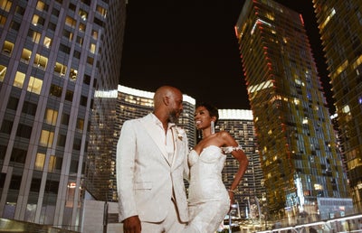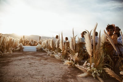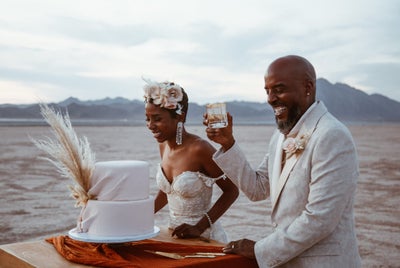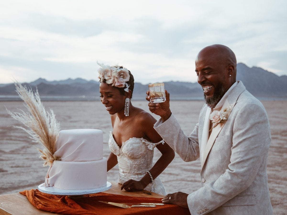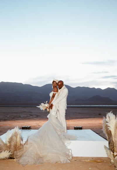 She would eventually feel the same, and after a romantic proposal in Aspen (on Proposal Bridge — more on that later), Andre proved that his instincts were correct and made Riqua his wife. They said “I do” on May 29 in a truly one-of-a-kind wedding that took place in the desert, at Dry Lake Bed in Las Vegas. They followed up the gorgeous ceremony with a celebration at the Waldorf Astoria (and a pool party the next day sponsored by Just Cannabis because why not?). The theme of everything was “Elope-ish,” as Vegas is the ultimate setting for glamour and adventure, which their big day was full of. How else can you describe a day that encompasses the desert, sunsets, showgirls and plenty of sparkle?