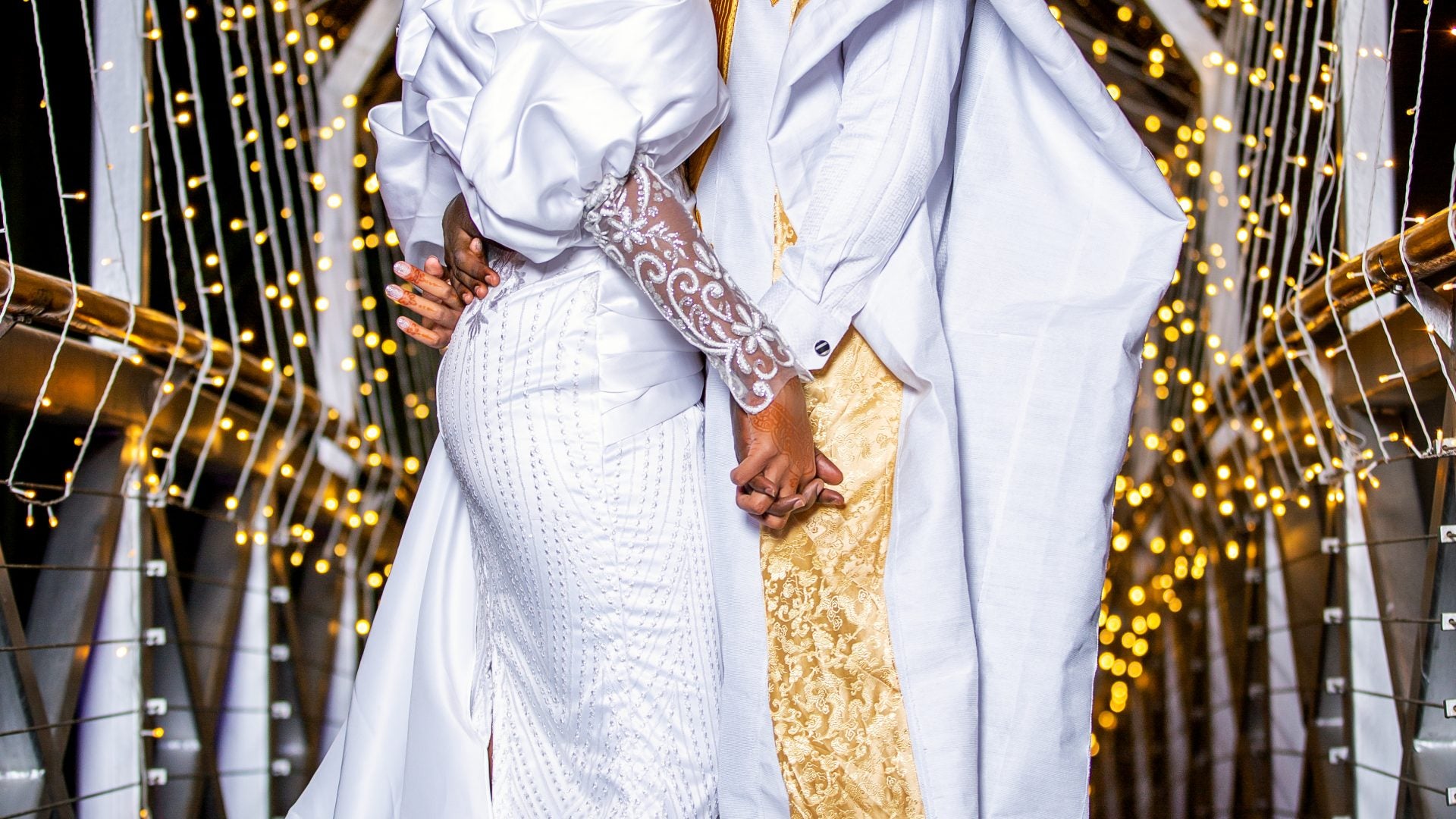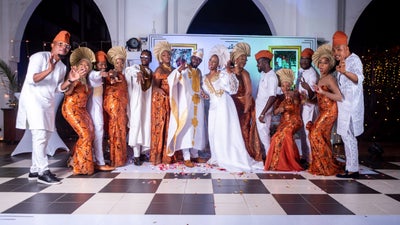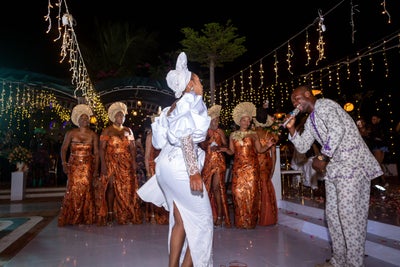 Live bands and performers at Nigerian weddings are a must! Sydaiya is seen enjoying the sounds from their celebration, wearing a gown created by popular Tanzanian designer Mahuames.