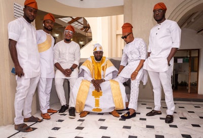 Sheriff is pictured posing in a traditional agbada along with his groomsmen. All of his pieces were sent from Nigeria.