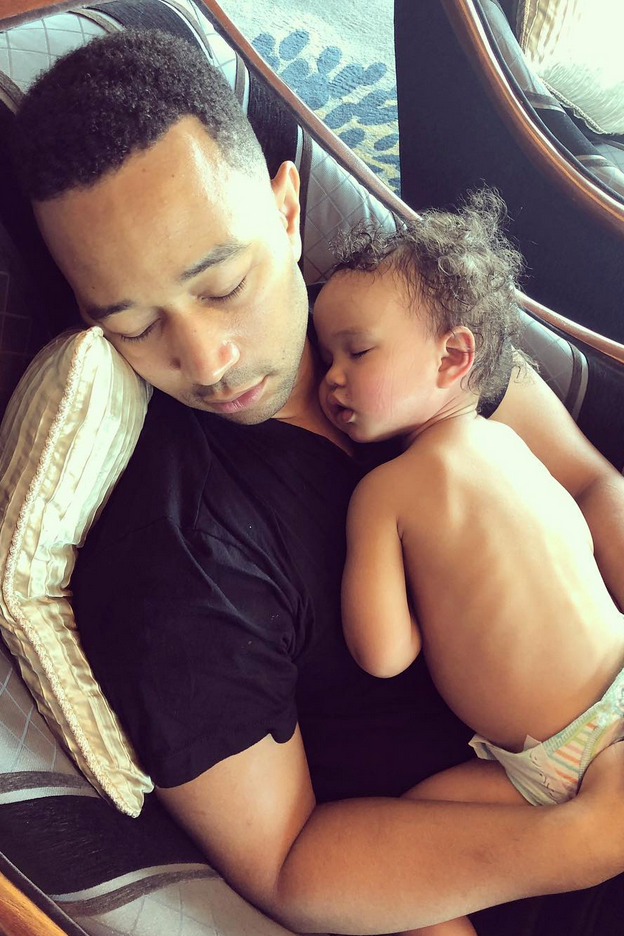 Singer-songwriter John Legend sleeps comfortably with his 2-year old daughter, Luna Simone Stephens, on his chest. Legend and his wife, Chrissy Teigen, just welcomed a bouncing baby boy in May.