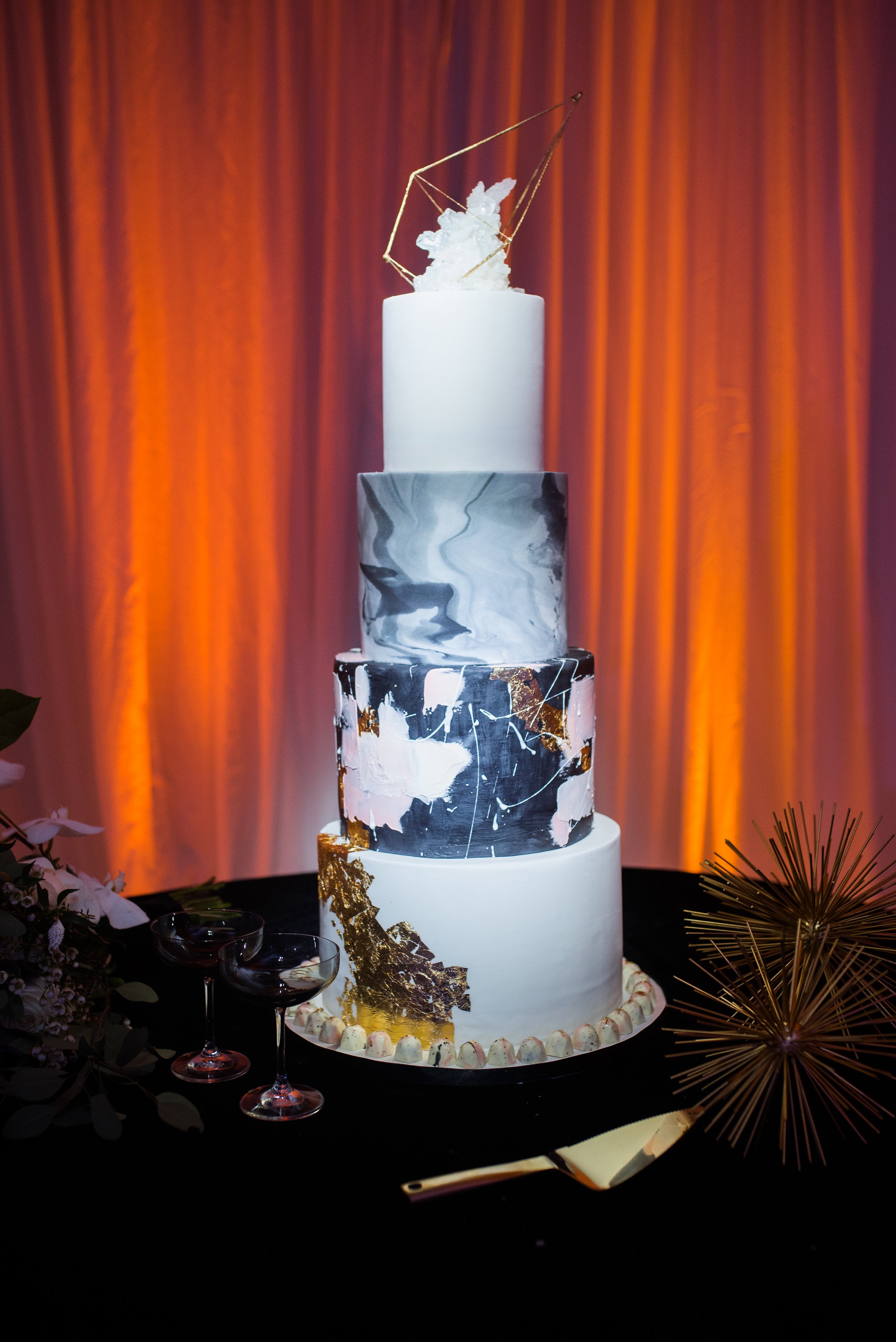 “Similar to the ceremony space, the decor was modern and romantic,” the bride shared. “Social Supply Events created a stage and marble-print backdrop to match the aisle runner from the ceremony. DC Rentals supplied cream velvet linens, black dinner napkins, glass chargers, marbles plates and brushed gold flatware. We also had crystal candelabras with black taper candles, mixed with a sea of floating candles. Audry Lane Creative designed the table names, menus and escort cards.”