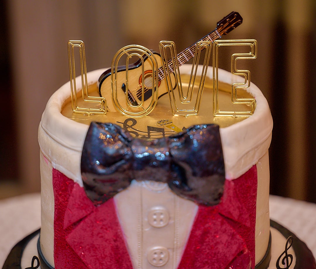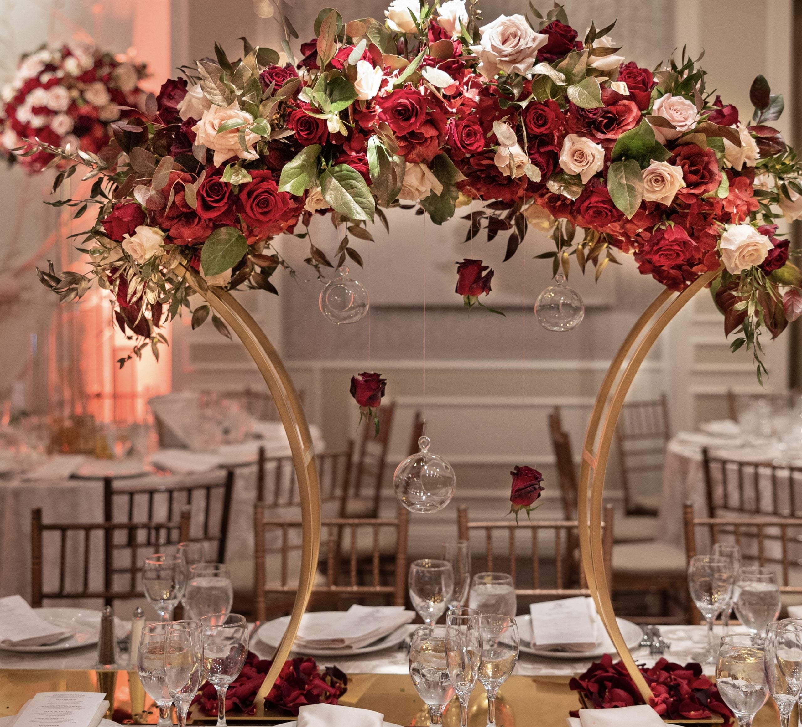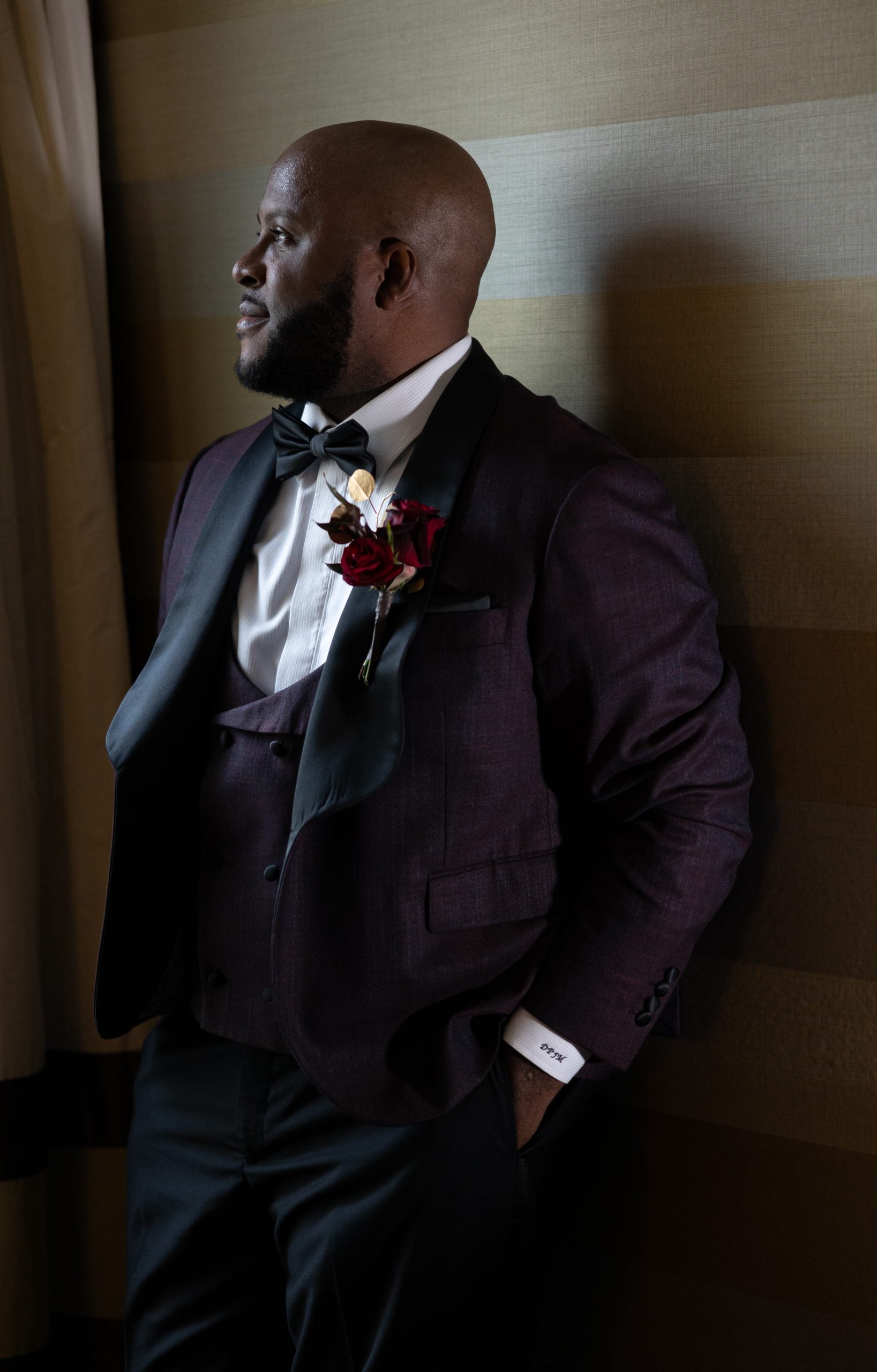 “We ultimately wanted the wedding itself to be a representation of the both of us, and we made just about every decision together,” Cherie says. “We ultimately went with a cabernet, gold and dusty rose color scheme, and decided we wanted a romantic winter wedding feel since our wedding was only 11 days after Valentine’s Day. We hired Denise from HACTAC Events for florals and day of coordination, told her that was what we were looking for, showed her a few pictures, and she delivered. While we didn’t have an official theme, we incorporated our mutual love for Broadway into our special day through some of our song selections, as well as theater ticket style seating cards and ticket themed table numbers made by Declan’s sister-in-law.”