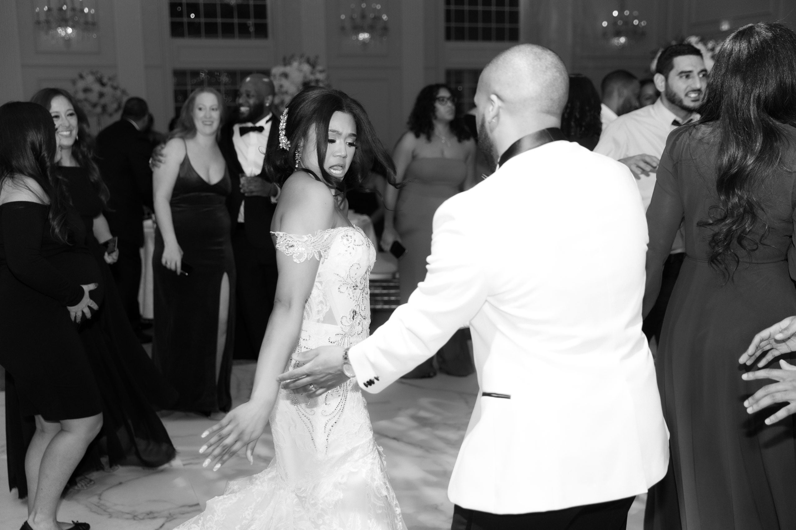 The couple cut up on the dance floor in front of their loved ones. You know the moves are on fire when the stank face comes out!
