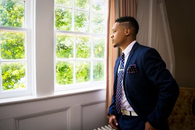 For his groom’s attire, Jamaal added a touch of pink to his look with a tie. Nice touch!