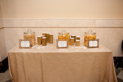 To help execute part of the Old Hollywood movie theme wedding, the couple had a popcorn bar for their guests which included, White cheddar and caramel, cheddar and caramel and pink lemonade. How clever and fun!