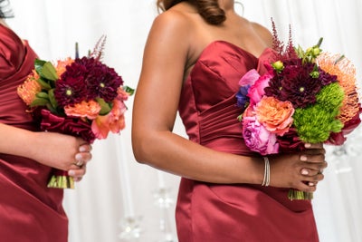 “For the bouquets and reception, we selected colors that are typically associated with my favorite season, fall; burgundy’s, rich deep oranges, and flashes of pink,” the bride reflected. “To infuse the bright hues of summer, we added pops of bright greens, peaches and pinks. Our floral designer used an assortment of flowers to include hydrangea, garden roses, ranunculus, dusty miller, orchids and dahlias.”