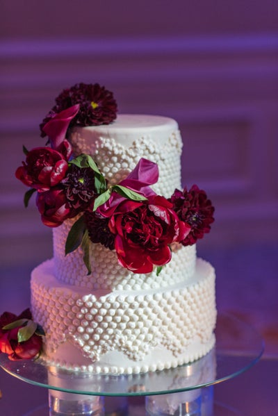 “We chose an all-white cake with a floral cascade that mirrored the floral centerpieces. We selected our favorite flavor of red velvet with white chocolate mousse and cream cheese icing.”