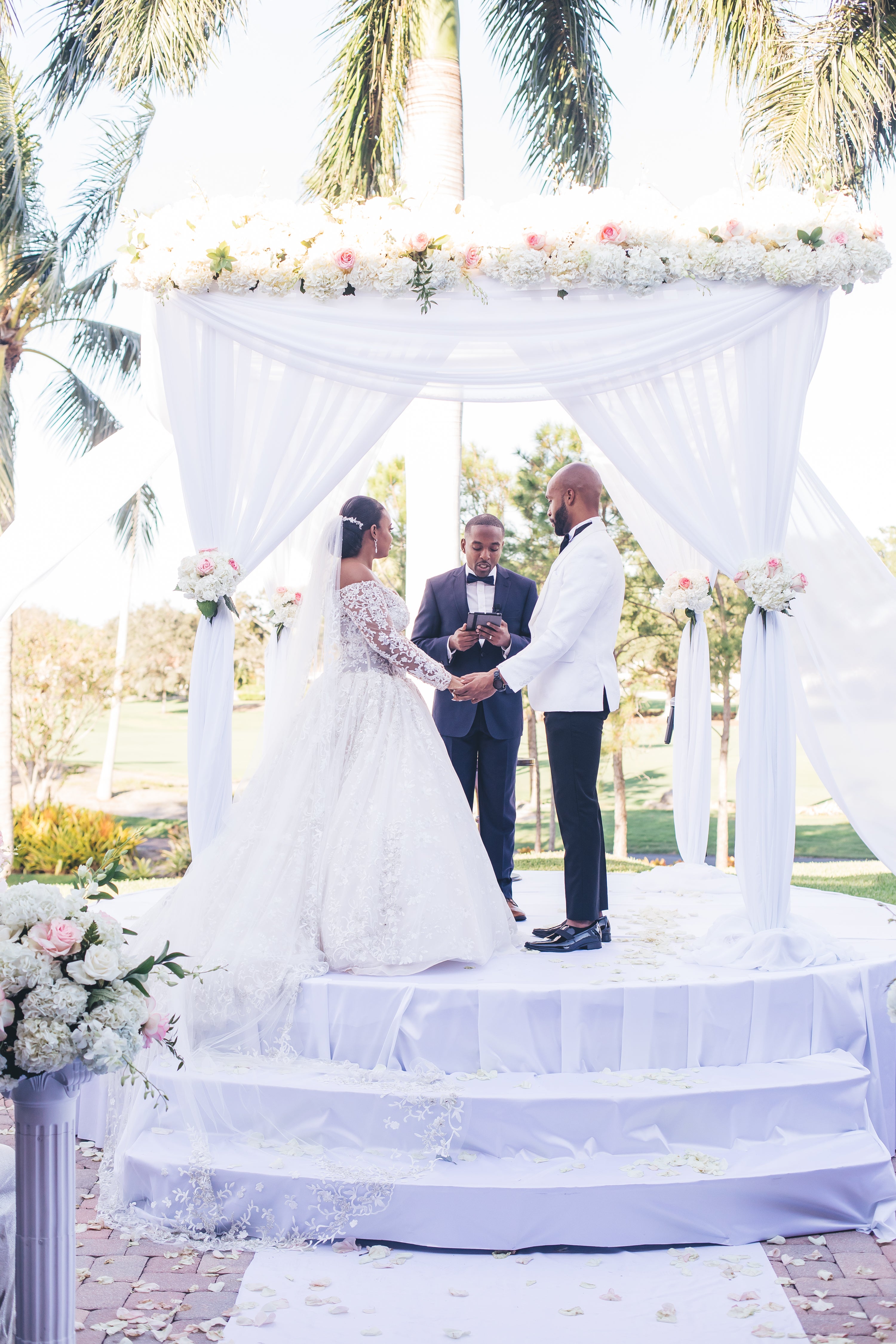 Kareem and Sandy chose a heavenly theme (perfect for this God-fearing couple) for their big day, and Broken Sound Club in Boca Raton, Florida was the perfect backdrop. “We had already put a deposit down on a venue that we honestly did not like but chose for convenience,” said Sandy Virgo. “I stumbled upon Broken Sound Club and was in disbelief. The large ballroom, beautiful outdoor scenery and chic décor were everything we wanted.”